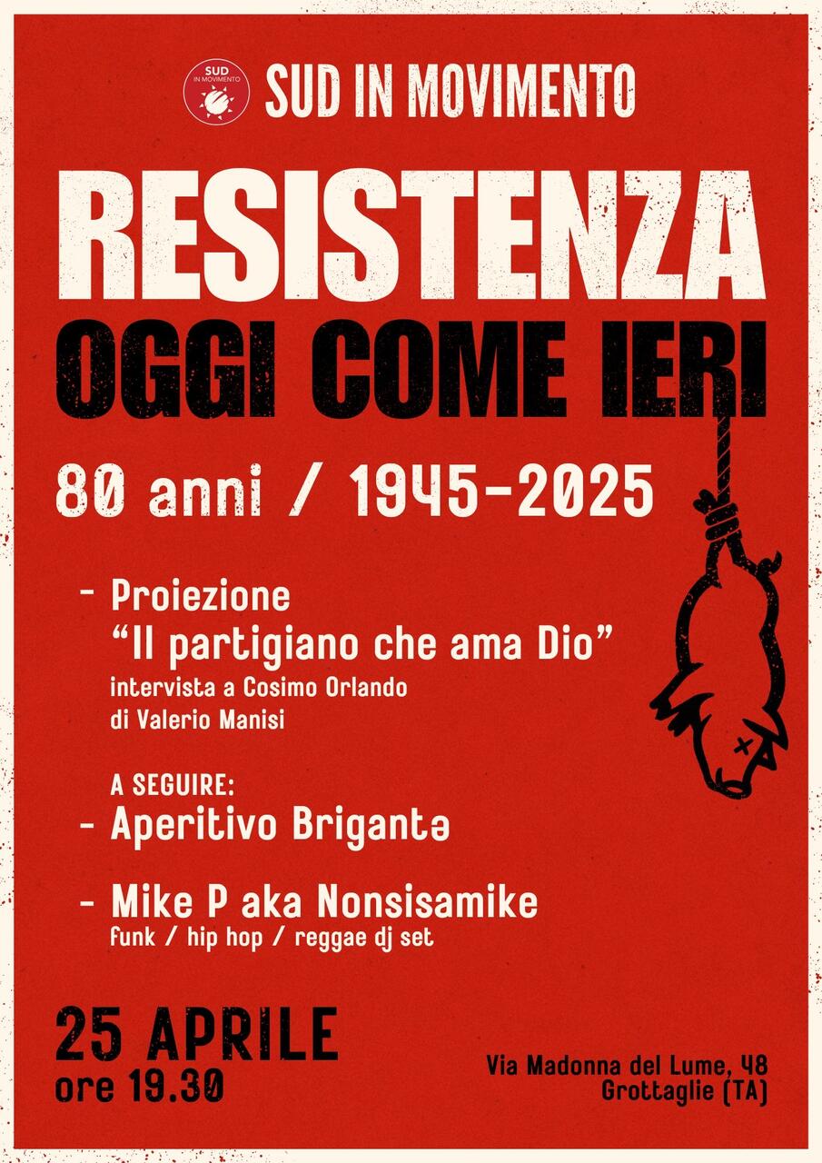 La diciassettesima edizione della Notte dei Briganti sarà dedicata quest’anno alla memoria della Resistenza, in occasione dell’80° anniversario della Liberazione dal nazifascismo. Un anniversario che Sud in Movimento ha scelto di onorare con un’intera stagione di iniziative culturali e politiche, volte a riaffermare il valore della libertà e della memoria storica.