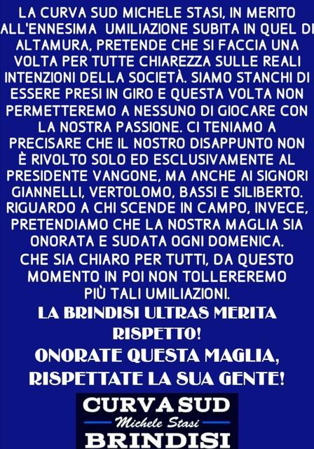 Home / Serie D Brindisi: La Curva Sud ‘Michele Stasi’, ‘Basta con le umiliazioni’ Iv. / 18 November 2019, 22:13 Twitter Facebook Whatsapp Telegram Email