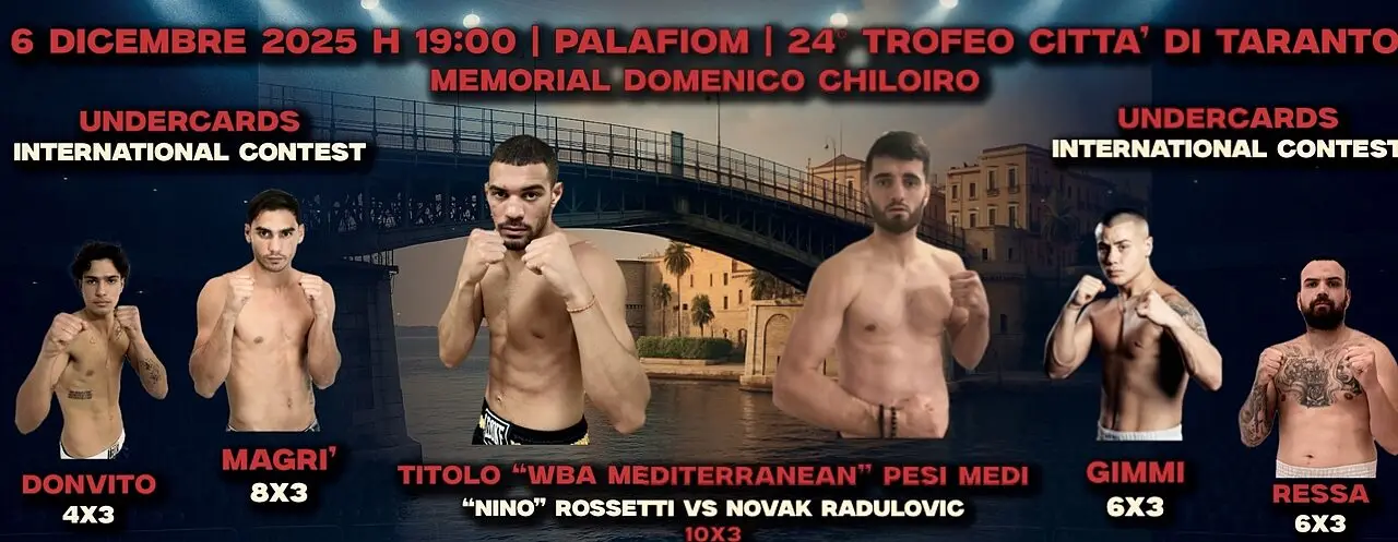 La manifestazione sarà di caratura internazionale e incentrata sul titolo del Mediteranneo WBA, -sigla tra le più antiche e prestigiose nel panorama mondiale di boxe, - che disputerà il peso medio tarantino Giovanni Rossetti, già campione mondiale youth UBO e campione italiano pesi medi nel 2022, sfidando sulle dieci riprese il pugile serbo Novak Radulovic, già campione del Mediterraneo WBC.