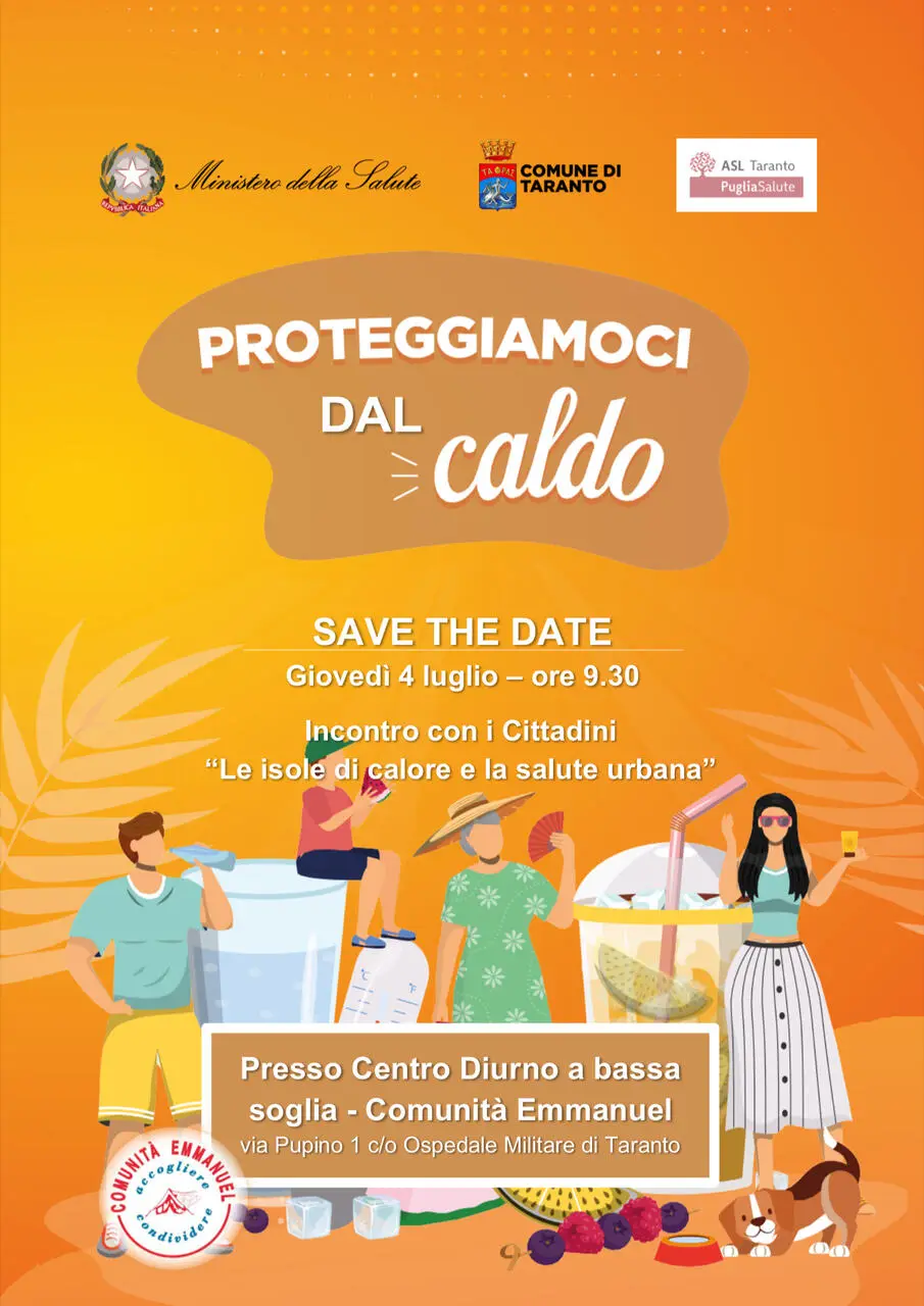 E proprio in quest’ottica, tenuto conto delle disposizioni Ministeriali vigenti per fronteggiare l’emergenza caldo, la ASL e il Comune di Taranto, nell’ambito dei Servizi Sociali, hanno organizzato per la giornata del 4 luglio, alle ore 9.30, presso il “Centro Bassa Soglia” di via Pupino 1, gestito dalla Comunità Emmanuel, un incontro informativo sul tema “Le isole di calore e la salute urbana”.