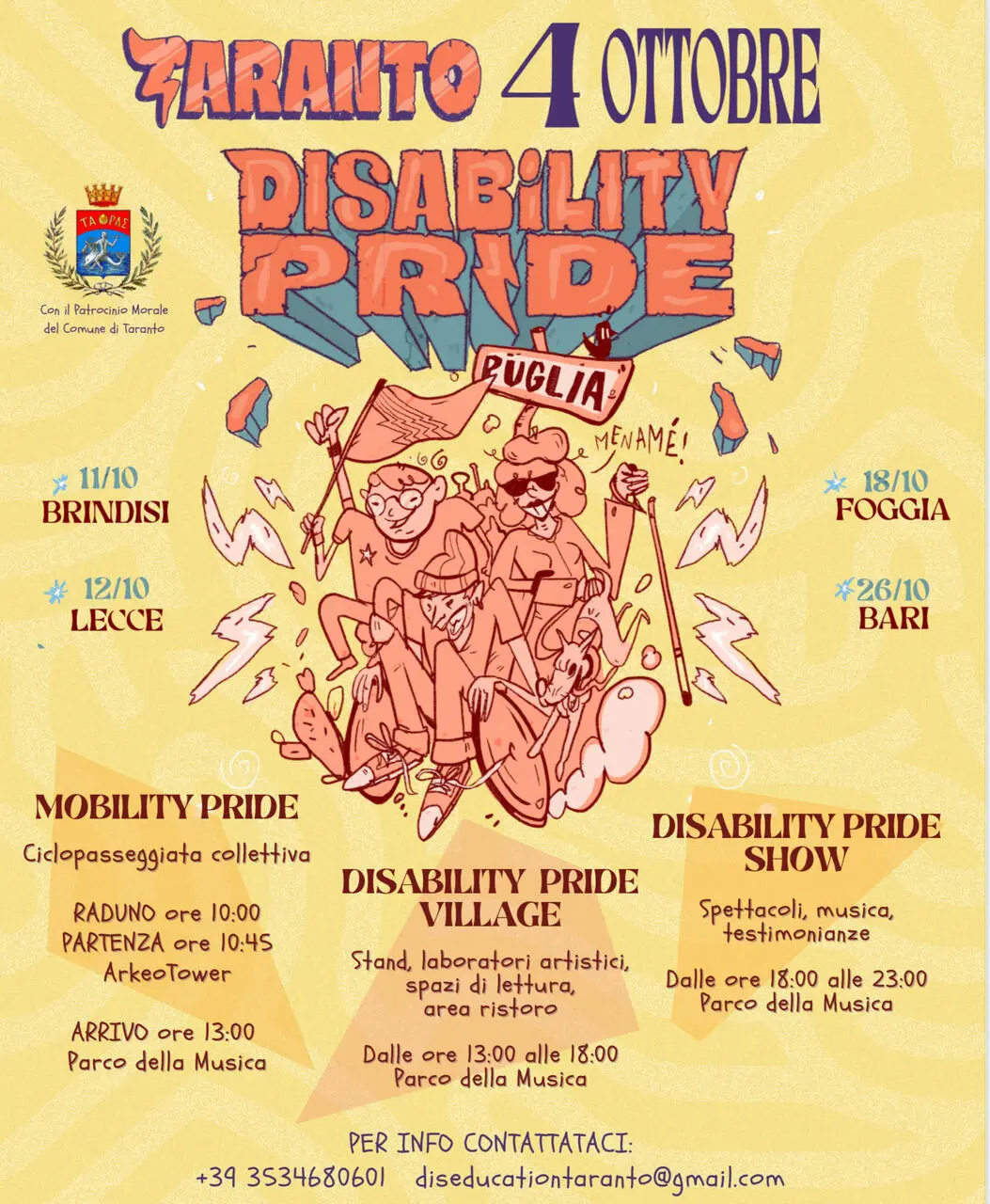 L’evento, a ingresso gratuito, gode del patrocinio del garante regionale della disabilità e del patrocinio morale del Comune di Taranto. È garantita l’accessibilità con interpreti LIS, in linea con lo spirito del Disability Pride: una giornata di festa e riflessione per promuovere inclusione, diritti e partecipazione.