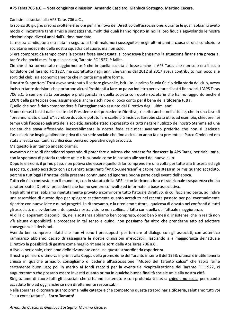 Gli ex consiglieri lamentano anche il rifiuto della maggioranza del Direttivo di convocare un’assemblea pubblica per chiarire quanto accaduto nella fase dei presunti contatti con gli acquirenti “anglo-americani” del Taranto (Mark Campbell, ndr), sottolineando che tale scelta contraddice lo spirito di trasparenza che da sempre ha caratterizzato il Trust. “Abbiamo insistito per mesi affinché si spiegasse ai soci quanto accaduto, ma senza esito. Non restava che prendere atto e dimetterci“.