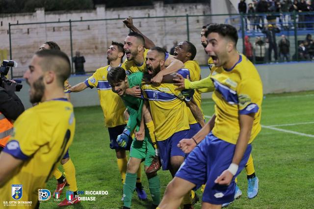 È la lotteria dei rigori, ancora una volta, a decidere il destino del Fasano in questa Coppa Italia Serie D 2019/2020. Dopo i 90’ terminati sul risultato di 1-1, con gol di Prinari e Russo, il rigore di Gerbaudo, parato da uno strepitoso Suma, consegna ai biancazzurri il pass per la storica semifinale. Mai infatti il sodalizio di via Salvo D’Acquisto si era spinto così in alto in questa competizione. Passando alla cronaca della partita, alla prima occasione e dopo 8’ il Fasano passa in vantaggio con Prinari che, lanciato a campo aperto da Dìaz, si ritrova da solo contro Fumagalli e non sbaglia.,Il match è giocato da entrambe le squadre con grande agonismo e forza fisica, motivo per cui le occasioni si vedono con il contagocce. Al 20’ però, il Fasano va vicino al raddoppio con un colpo di testa di Rizzo su calcio d’angolo di Corvino, pallone che termina di poco fuori. Al 42’pt, alla prima e forse unica occasione della gara avuta dal Foggia, arriva il pareggio con il colpo di testa di Russo su cross di Campagna. Allo scadere dei 3’ minuti di recupero concessi dall’arbitro, ultimo brivido per i satanelli: Prinari si gira in area e di punta tira mirando l’angolino ma Fumagalli è miracoloso e si rifugia in corner. Nella ripresa, al 14’, altra grande occasione per il Fasano: Prinari vola sulla fascia destra, mette al centro una palla tesa ma Corvino non ci arriva per un soffio. Secondo tempo giocato sostanzialmente a centrocampo dalle due squadre, tant’è che un’altra occasione da gol si rivede al 43': Cavaliere si gira in area, si coordina ma il suo tiro si stampa sul palo rimandando la questione ai calci di rigore. Perfetti i cinque tiri biancazzurri dal dischetto, decisiva la parata di Suma su Gerbaudo e l’ultimo rigore tirato dal capitano Ganci. Appuntamento dunque alla semifinale, con il Fasano che sfiderà la vincente tra Pineto e Tolentino. Non sarà una partita secca come accaduto finora ma si giocherano le gare di andata e di ritorno.