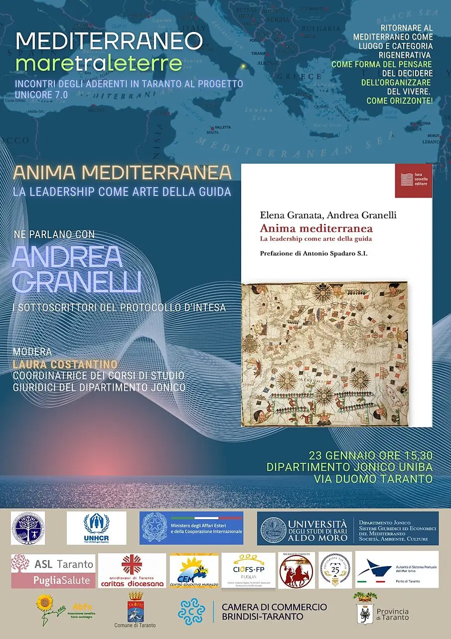 Venerdì 23 gennaio 2026, a partire dalle ore 15:30 presso il Dipartimento Jonico UNIBA, in Via Duomo 259, Andrea Granelli – coautore con Elena Granata di Anima mediterranea. La leadership come arte della guida (Luca Sossella editore), sarà a Taranto in un incontro-seminario aperto alla Città. “Un'anima, quella mediterranea, che va ri-appresa in una paideia, in un itinerario di pensiero critico e di azioni costruttive”, scrivono gli autori.