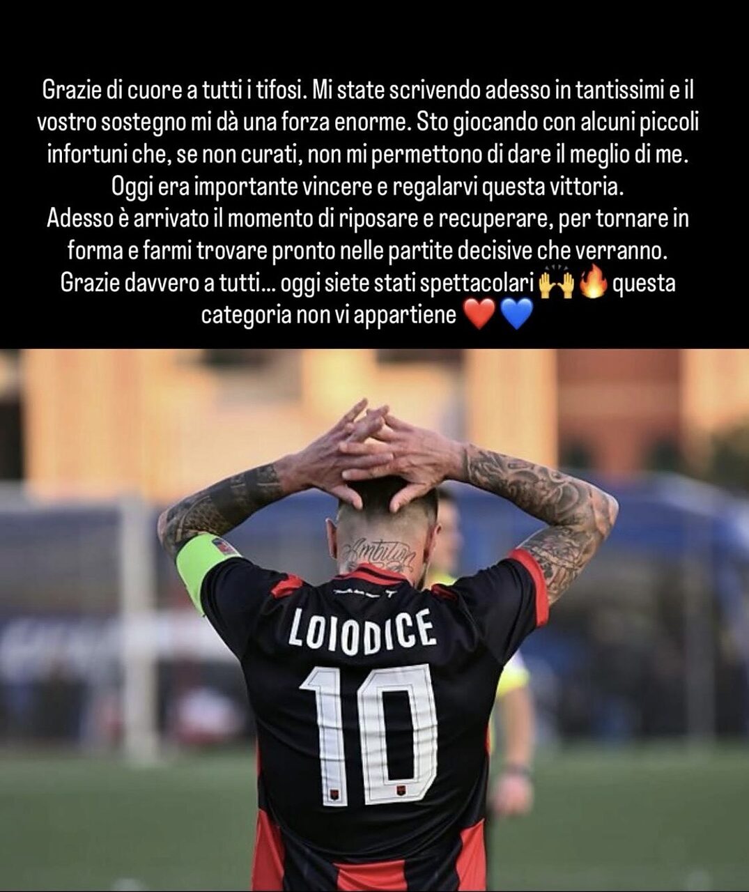 “Grazie di cuore a tutti i tifosi. Mi state scrivendo adesso in tantissimi e il vostro sostegno mi dà una forza enorme - scrive il capitano -. Sto giocando con piccoli infortuni che, se non curati, non mi permettono di dare il meglio di me”.