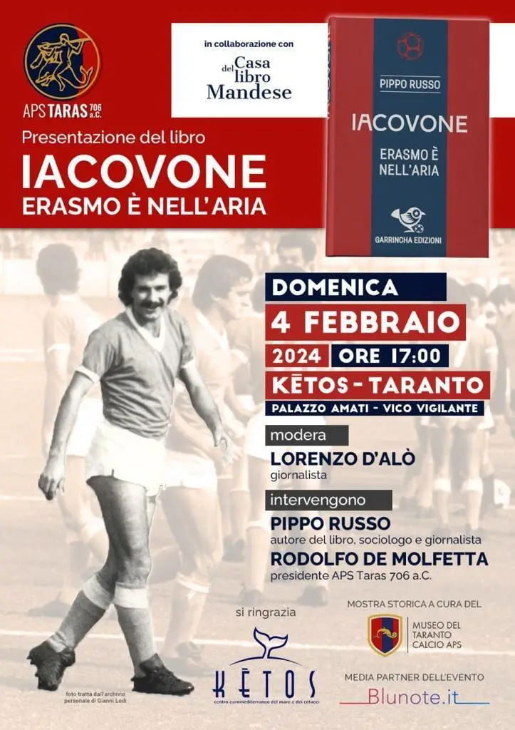 In occasione del 46° anniversario della scomparsa di Erasmo, l'APS Taras 706 a.C. organizza la presentazione del libro "Iacovone. Erasmo è nell'aria" di Pippo Russo, sociologo, saggista e giornalista di fama nazionale.