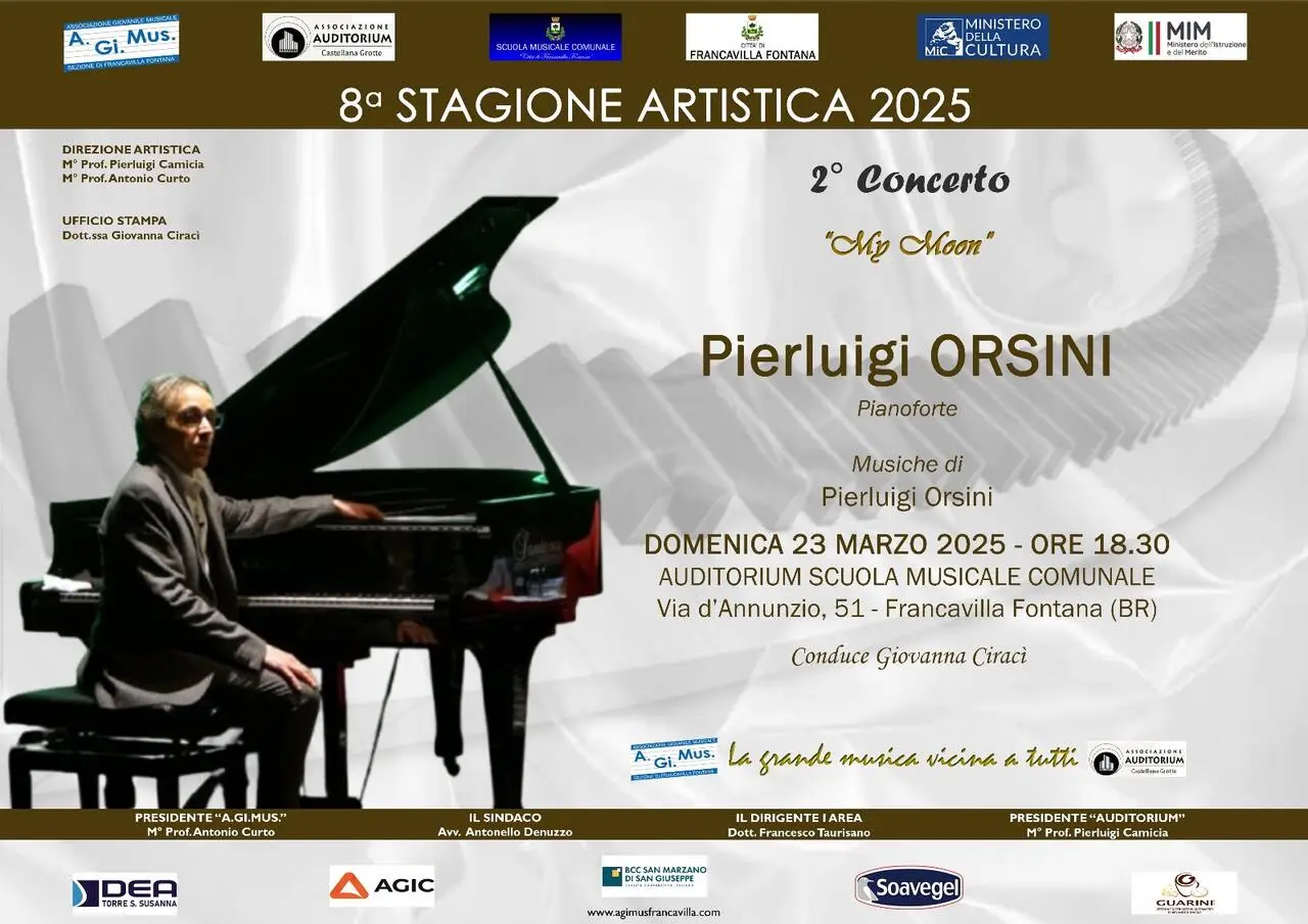 Secondo appuntamento imperdibile per la Stagione Artistica 2025 dell’AGiMus di Francavilla Fontana: domenica 23 marzo, alle ore 18.30, l’Auditorium della Scuola Musicale Comunale ospiterà il concerto del pianista Pierluigi Orsini, intitolato “My Moon”.
