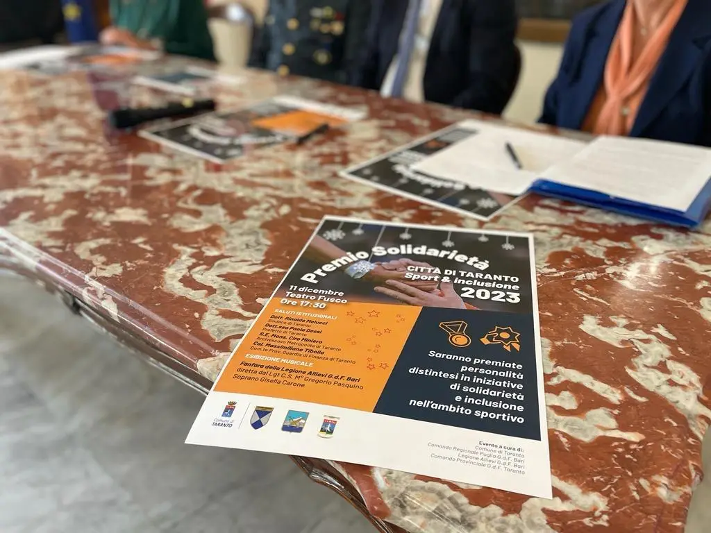 È stata presentata a Palazzo di Città la prima edizione del “Premio Solidarietà – Città di Taranto”, riconoscimento che quest’anno sarà assegnato a personalità che si sono distinte in iniziative che hanno favorito l’inclusione nel mondo dello sport. L’appuntamento è per le 17:30 del prossimo 11 dicembre, al teatro comunale “Fusco”, con un ricco programma che prevedrà anche momenti culturali e musicali.