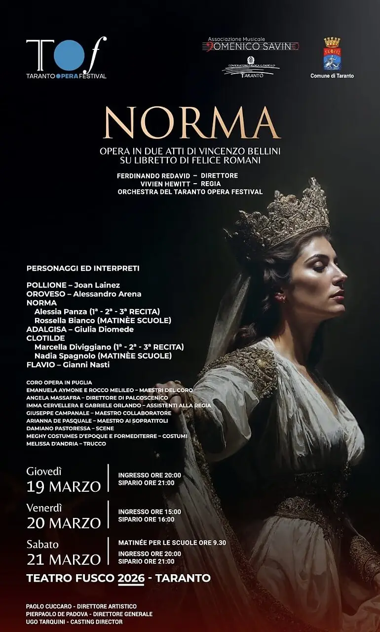 Il Taranto Opera Festival presenta “Norma”, opera in due atti di Vincenzo Bellini su libretto di Felice Romani, in programma al Teatro Fusco di Taranto il 19, 20 e 21 marzo 2026. La produzione, realizzata dall’Associazione Musicale Domenico Savino, con il patrocinio del Comune di Taranto e la partecipazione del Conservatorio Giovanni Paisiello, rappresenta l’ultimo appuntamento della stagione invernale 2025-2026.