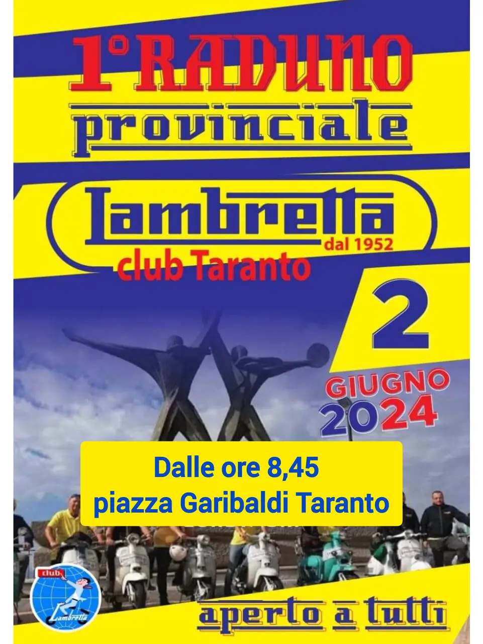 Il Lambretta Club Taranto organizza il 1° Raduno Provinciale Taranto, aperto a tutte le moto d'epoca di qualsiasi marca e modello.
