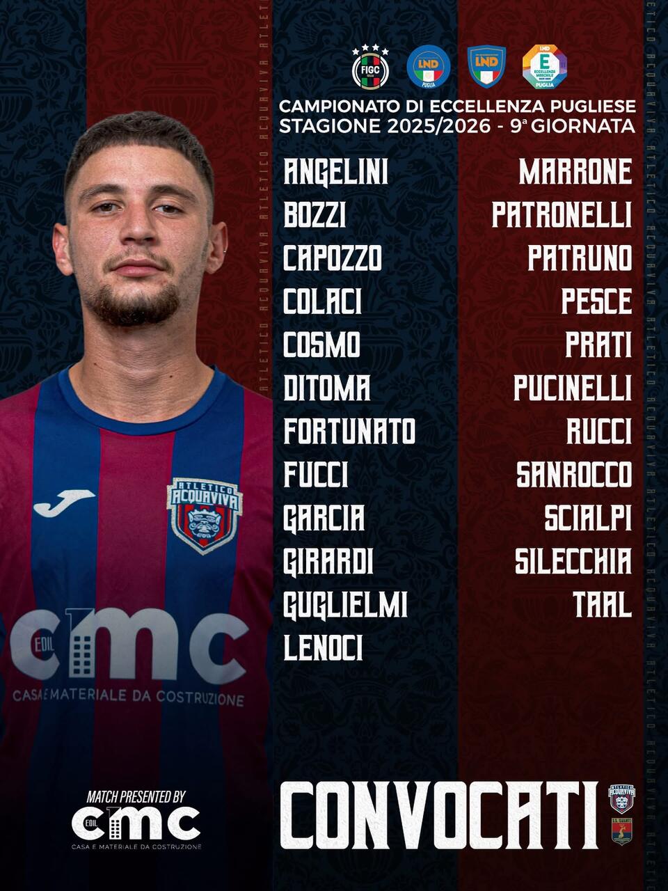 Andrea Solidoro, tecnico dell'Atletico Acquaviva, ha diramato la lista dei convocati per la sfida casalinga contro la capolista Taranto, in programma alle 15.30 di domenica 19 ottobre. Ci sono i nuovi innesti Prati, Marrone, Rucci e Patruno. Ecco l'elenco della compagine barese.