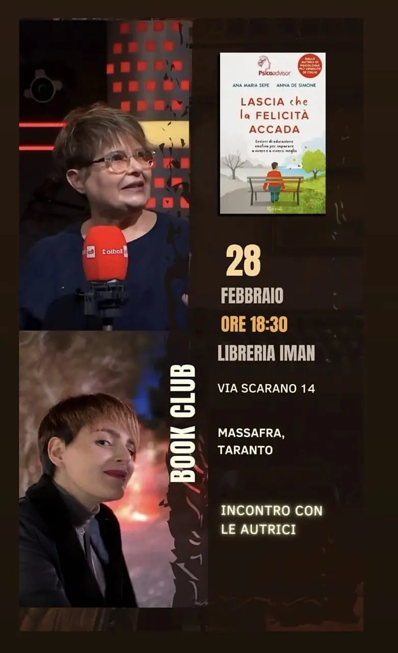 MASSAFRA – Un gradito ritorno alla libreria Iman di Massafra: sabato 28 febbraio prossimo alle 18:30 la sede di via Colonnello Scarano, 27 accoglierà le dottoresse Ana Maria Sepe e Anna De Simone.