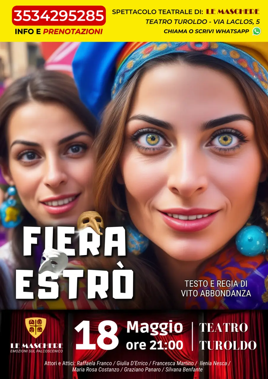Una commedia brillante, non la solita commedia, uno spettacolo nel quale gli attori sono stati capaci di creare dal nulla il personaggio portato in scena; questo è lo “scrigno” di “Fiera Estrò” che andrà in scena sabato 18 maggio (inizio ore 20:30) al Teatro Turoldo di Taranto (sito in via Laclos,5) dagli attori della Compagnia Teatrale “Le Maschere” con testo e regia di Vito Abbondanza. La rappresentazione nasce dalla natura dei personaggi che animano la commedia, il titolo dello spettacolo riprende il luogo presso il quale si svolge la storia. I personaggi sono particolari al punto da risultare estrosi e nascondono al loro interno un profondo bisogno di stare insieme dal vivo, e non tramite i social network come siamo abituati al giorno d’oggi; il caso ha voluto farli incontrare nei pressi di una fiera. In questa fiera incontreremo Carlo (interpretato da Graziano Panaro) venditore di oggetti “intimi”, Teresa (Giulia D’Errico) la “regina” delle arance, Martina (Ilenia Nesca) artista e cantante, Jo (Francesca Martino) venditrice di abiti vintage, Concetta (Maria Rosa Costanzo) donna che soffre di solitudine e offre a tutti la sua compagnia, Pazienza (Raffaela Franco) che lavora come cacciatrice di squali e Oceania (Silvana Benfante) una donna che dice essere una creatura nata dal mare. A presenziare in questo carnevale caleidoscopico ci saranno anche dei bambini che impareranno almeno per un giorno a vivere senza linea internet, ma soprattutto impareranno che bisogna guardare il mondo dal vivo e non attraverso uno schermo. Stravaganza e divertimento in questa commedia come sottolinea Giulia D’Errico, una delle attrici dello spettacolo: “E’ di sicuro un’opera brillante, stravagante e divertente; l’obiettivo è quello di regalare al pubblico momenti di svago dalla solita routine. Insieme agli altri attori abbiamo realizzato dei personaggi che rispecchiamo in parte alcuni luoghi comuni ma allo stesso tempo ti spingono ad andare oltre le apparenze e gli stereotipi in maniera leggera. Vogliamo trasmettere agli spettatori la stravaganza dei personaggi portati in scena ma che faccia, allo stesso tempo, riflettere. Attraverso vari sketch che ripercorrono le dinamiche che possono verificarsi all’interno di una fiera per lo più stravagante vi condurremo al di fuori della realtà quotidiana per vivere insieme qualcosa di straordinario”. Giulia descrive il suo personaggio così: “Porto in scena Teresa Cardone, una donna che vende la frutta, lei si fa chiamare la “regina delle arance” ed è molto legata alla sua terra e alle sue origini. Secondo lei solo la frutta è degna di attenzione in quanto salutare perciò intraprende una battaglia contro il mondo degli ortaggi e di tutti gli altri alimenti, in quanto solo la frutta fa bene e deve essere acquistata. Teresa è una persona genuina ma non è abituata ad interagire con persone diverse da quelle del suo quotidiano. Però dopo una fase iniziale nella quale risulta restia ad interagire con gli altri personaggi della commedia, anche lei si lascerà coinvolgere dalla loro stravaganza dagli altri protagonisti”. “Fiera Estrò” è un’opera che fa divertire e allo stesso tempo riflettere, la D’Errico ci spiega a quale pubblico è adatta: “E’ per tutti quelli che vogliono passare una giornata diversa dal solito anche ai bambini in quanto i dialoghi hanno un linguaggio semplice e comprensibile per tutti. Il pubblico di sicuro sarà coinvolto dalla stravaganza dei personaggi, a tale riguardo vi invito a portare dei tovaglioli se volete delle arance!”