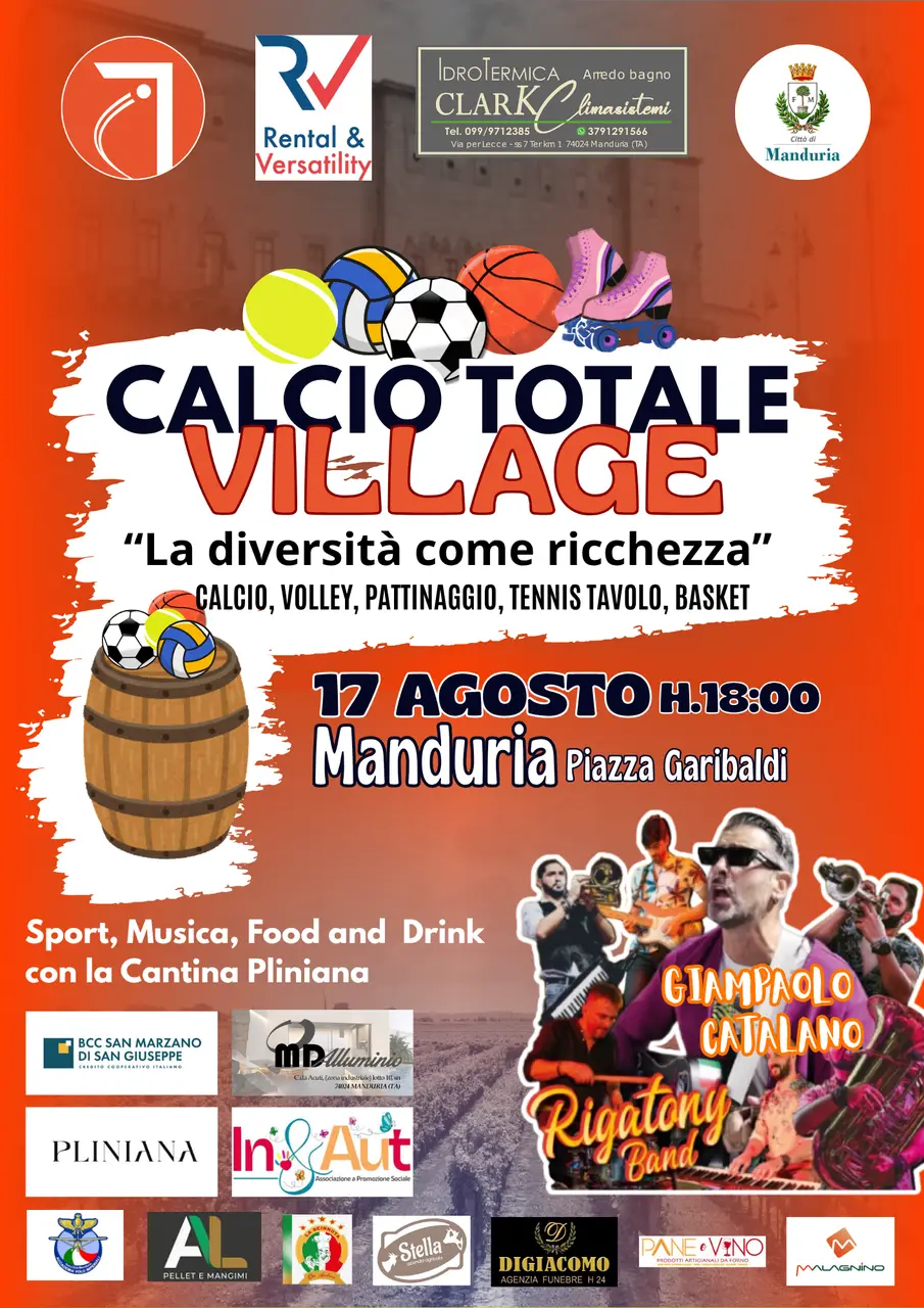 La giornata sportiva avrà un tema forte per promuovere l’inclusione sociale: “La diversità come ricchezza”. In collaborazione con l’associazione In&Aut Aps, un team che opera su Manduria per il benessere esistenziale delle persone con disturbo del neurosviluppo. Il team di Calcio Totale, insieme ai partner sta già lavorando per lasciare qualcosa di concreto e tangibile. L’evento è patrocinato dal comune di Manduria ed è supportato da molteplici aziende del territorio che hanno sposato il progetto del “Calcio Totale Village”. Seguiranno tante altre sorprese durante la serata: 17 agosto Manduria, a partire dalle ore 18.00.