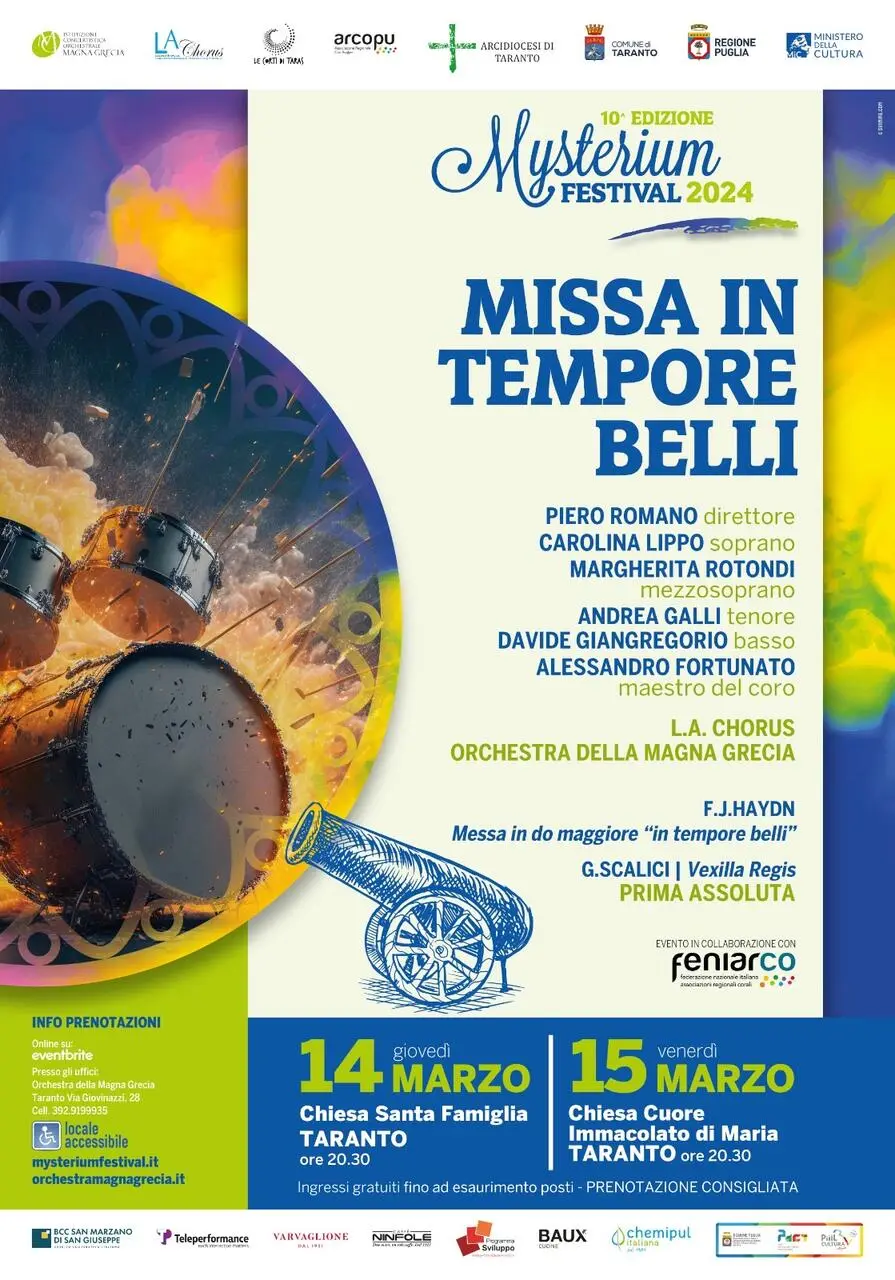 “Missa in tempore belli” e prima assoluta di “Vexilla Regis”. Giovedì 14 (Chiesa Santa Famiglia) e venerdì 15 marzo (Chiesa Cuore Immacolato di Maria). Inizio ore 20.30. Ingresso gratuito fino ad esaurimento posti (consigliabile la prenotazione). Online: Eventbrite. Info: Orchestra Magna Grecia – Via Ciro Giovinazzi 28, Taranto (392.9199935). Aggiornamenti social (Facebook e Instagram). Siti: mysteriumfestival.it e orchestramagnagrecia.it