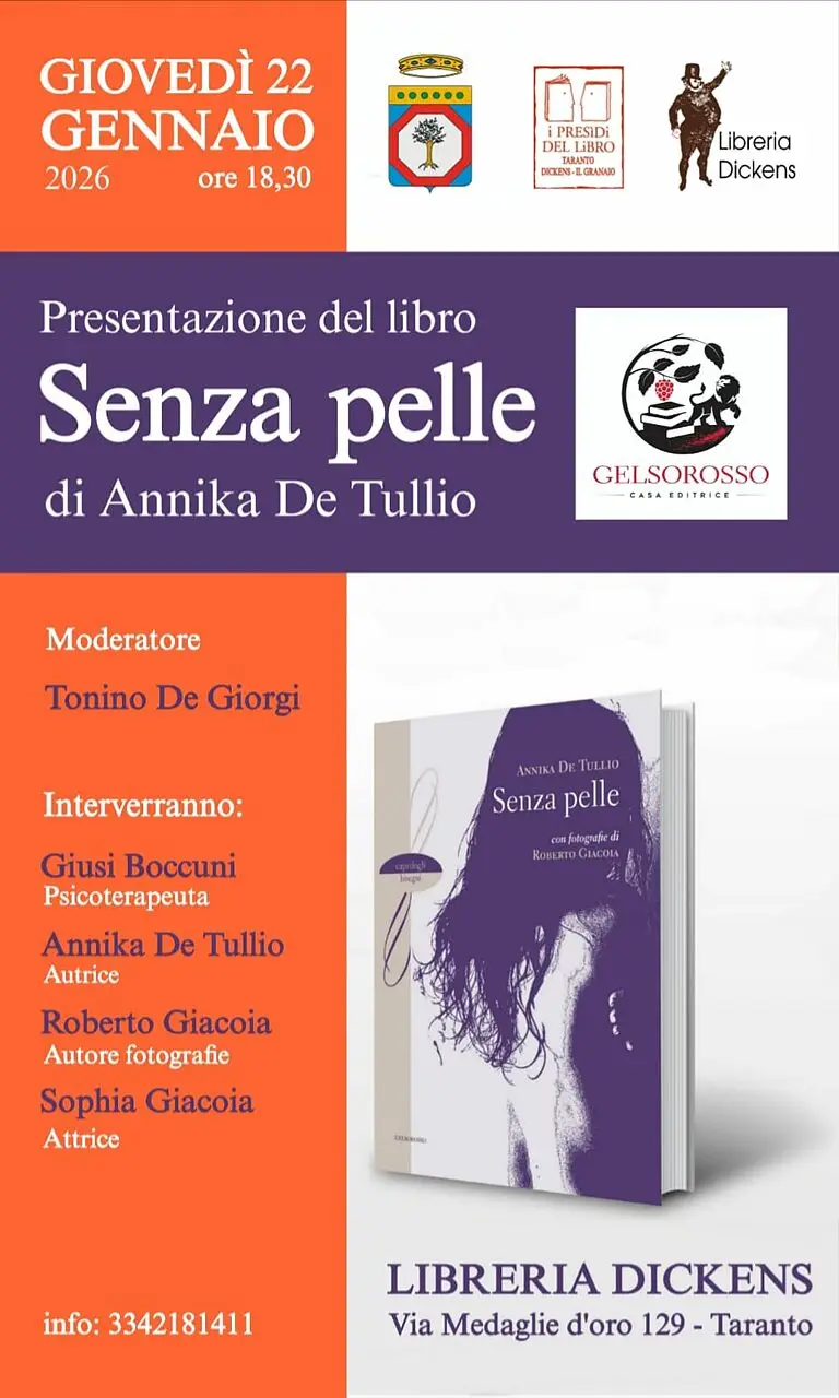 Giovedì 22 gennaio 2026, alle ore 18.30, la Libreria Dickens ospiterà la presentazione del libro Senza pelle, opera poetico-visiva di Annika De Tullio, con fotografie di Roberto Giacoia, edita da Gelsorosso.