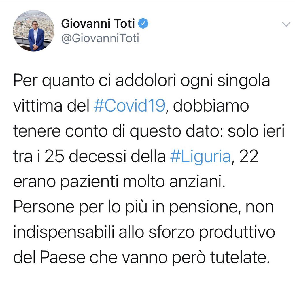 "Il Paese non può permettersi un nuovo lockdown", dice il presidente della Regione Liguria Giovanni TotI il quale in una nota sui social suggerisce che bisogna intervenire sulla categoria più fragile, gli anziani. Ma scoppia la bufera perché Toti scrive anche, parlando degli anziani: "Si tratta di persone che sono per fortuna per lo più in pensione, non sono indispensabili allo sforzo produttivo del Paese ma essendo più fragili vanno tutelate in ogni modo". Il senso di questo tweet, che appartiene a un ragionamento più ampio, è stato frainteso. I nostri anziani sono i più colpiti dal virus, sono persone spesso in pensione che possono restare di più a casa e essere tutelate di più. "Proteggendo i nostri anziani di più e davvero, la pressione sugli ospedali e il numero dei decessi diventerebbero infinitamente minori. Sarebbe folle richiudere in casa tanti italiani per cui il Covid normalmente ha esiti lievi, bloccare la produzione del Paese, fermare la scuola e il futuro dei nostri giovani e non considerare alcun intervento su coloro che rischiano davvero. Speriamo ci sia saggezza stavolta e non demagogia" scrive. Toti, dopo le polemiche, è stato costretto ad un nuovo tweet: "Il senso di questo tweet, che appartiene a un ragionamento più ampio, è stato frainteso. I nostri anziani sono i più colpiti dal virus, sono persone spesso in pensione che possono restare di più a casa e essere tutelate di più". Toti aveva scritto, tra l'altro, parlando degli anziani: "Si tratta di persone che sono per fortuna per lo più in pensione, non sono indispensabili allo sforzo produttivo del Paese ma essendo più fragili vanno tutelate in ogni modo".