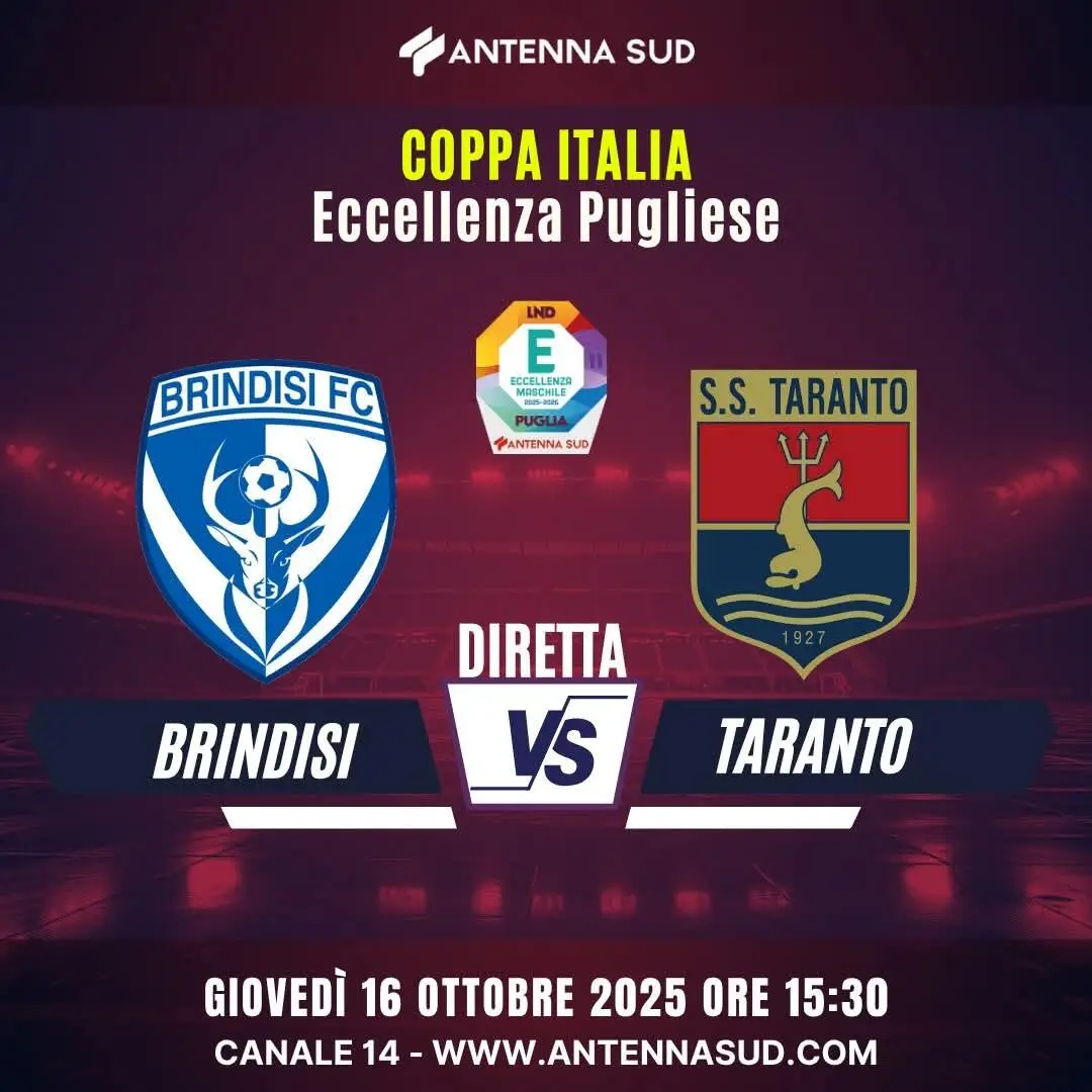 Giovedì 16 ottobre 2025, alle 15:30, si disputerà il match di Coppa Italia Eccellenza Pugliese tra Brindisi e Taranto. La gara sarà trasmessa in diretta su Antenna Sud, canale 14 del digitale terrestre e in streaming sul sito www.antennasud.com. La sfida, valida per il ritorno del primo turno (andata 0-0), metterà di fronte due piazze storiche del calcio pugliese, pronte a contendersi la qualificazione proseguire il cammino in Coppa. Vale la pena di ricordare che i gol fuori casa valgono doppio. La squadra che passerà al secondo turno se la vedrà con l’Atletico Acquaviva.