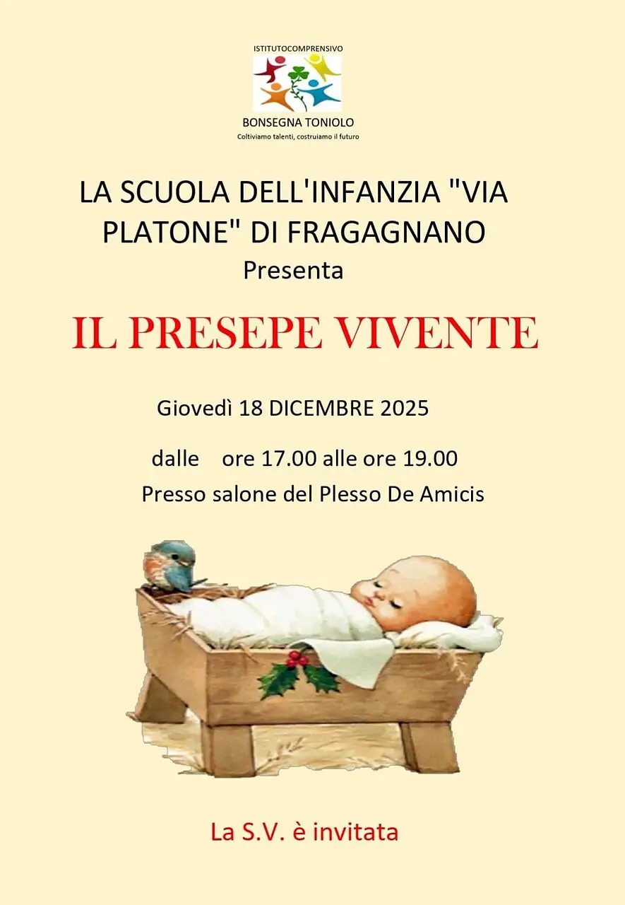 La Scuola dell’Infanzia “Platone” di Fragagnano è lieta di annunciare la realizzazione del Presepe Vivente, che si terrà giovedì 18 dicembre alle 17:00 nel salone dell’ex Scuola Media “De Amicis”, trasformato per l’occasione nel piccolo villaggio di Betlemme.