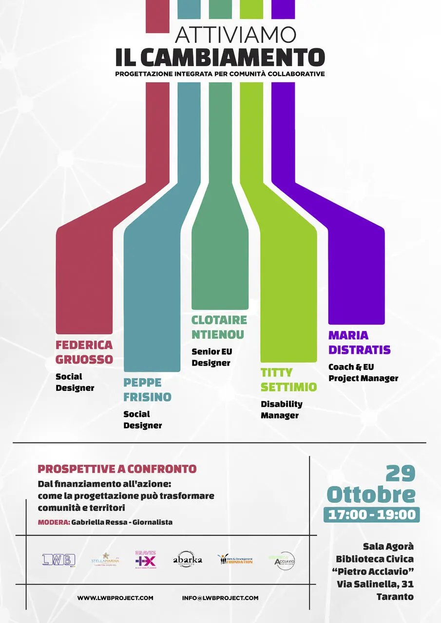 LWBProject srl, Associazione Stella Marina APS e Braves Community organizzano un evento dedicato all’importanza di una progettazione che vada oltre il semplice finanziamento, puntando a generare un impatto concreto e duraturo sul territorio. L’incontro, che si terrà martedì 29 ottobre 2024 dalle 17:00 alle 19:00 presso la Sala Agorà della Biblioteca Acclavio di Taranto, sarà un’occasione per riflettere su come le idee progettuali possano rispondere ai bisogni mutevoli delle comunità.