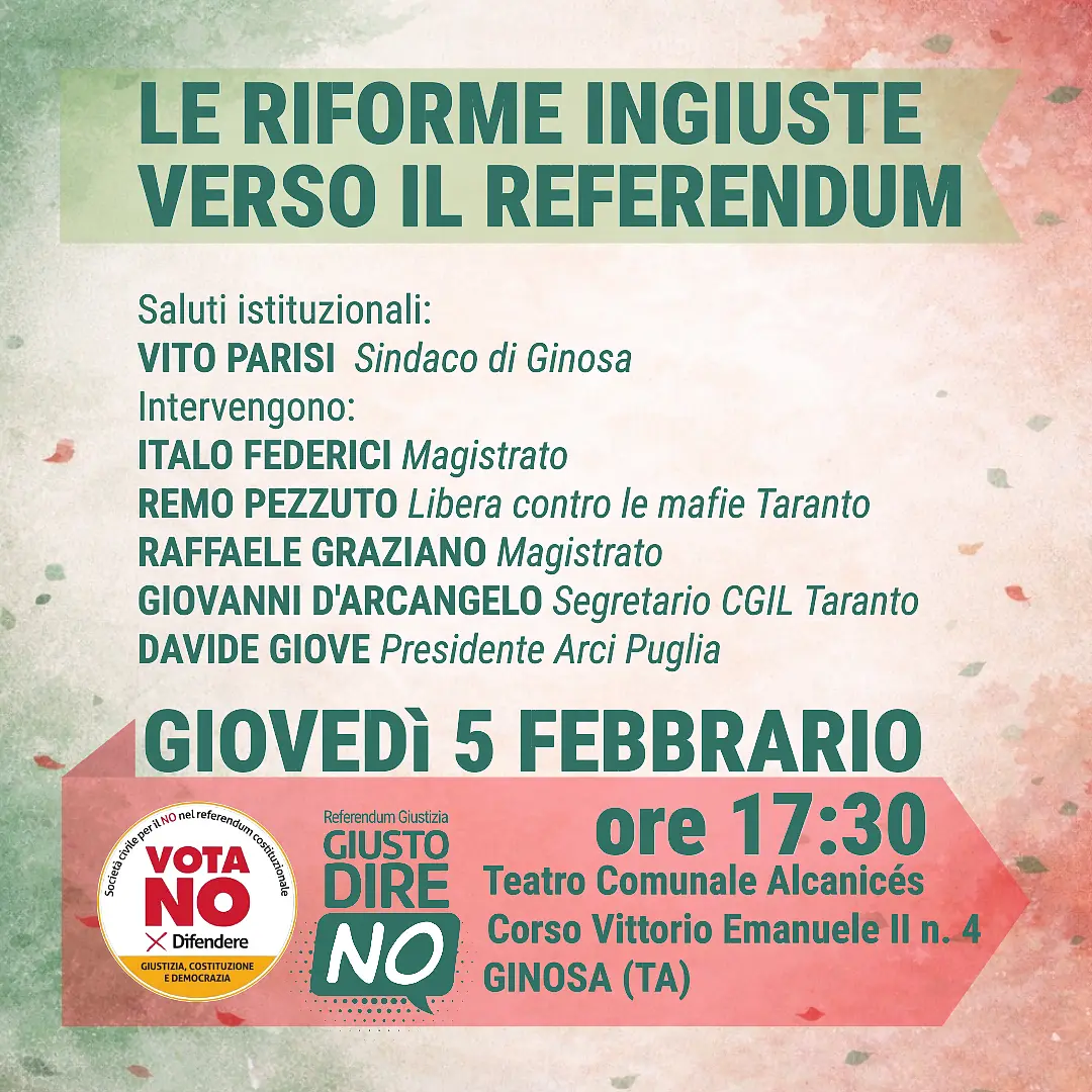 Giovedì 5 febbraio, alle ore 17:30, il Teatro Comunale Alcanicés di Ginosa ospiterà l’incontro pubblico dedicato al tema delle riforme della giustizia e dell’assetto costituzionale del Paese, in vista di un possibile passaggio referendario. L’iniziativa rientra in un percorso di informazione e confronto rivolto alla cittadinanza, con l’obiettivo di favorire una partecipazione consapevole su temi che incidono profondamente sull’equilibrio tra i poteri dello Stato e sui diritti delle persone.