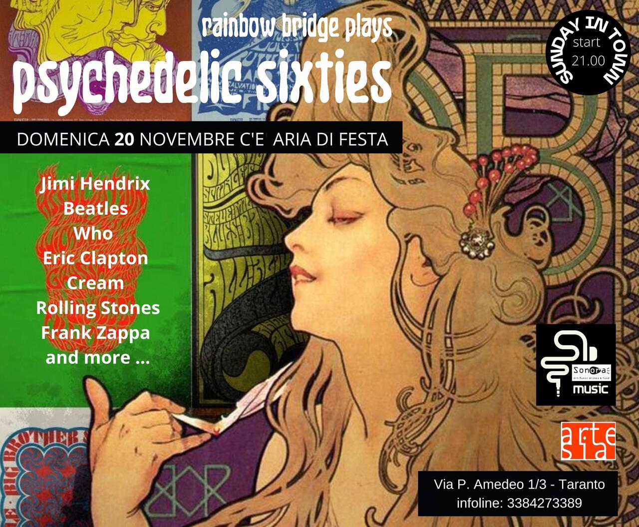 Domenica 20 novembre, ore 21.00, al Sonora - Art Music Drinks & Food (via P. Amedeo 1/3 - Taranto): Rainbow Bridge plays Psychedelix Sixties. Il trio Rainbow Bridge nasce nel 2006 per proporre una libera interpretazione del sound della Jimi Hendrix Experience. Grazie ad un primo demo nel 2010 la band riceve apprezzamenti anche dagli Stati Uniti – la webzine dedicata alla psichedelia Sodashop.com li ha definiti "a fucking cool tribute" – e dalla Germania.