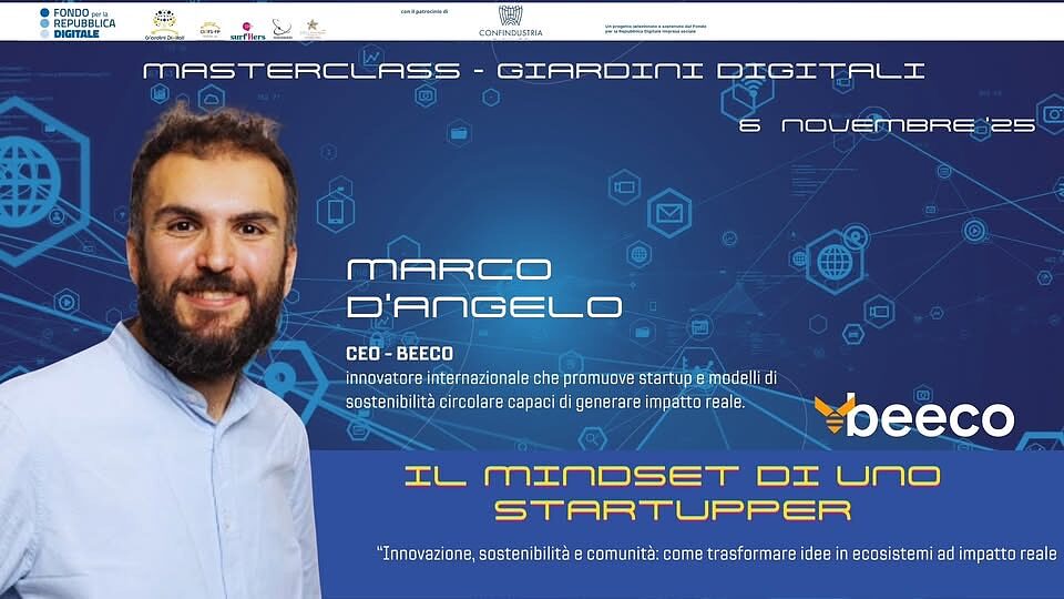 Dalle serre intelligenti alle scuole, dai prototipi all’impatto sociale concreto. La prossima masterclass di Giardini Digitali, il progetto selezionato e sostenuto dal Fondo per la Repubblica Digitale - Impresa Sociale ospiterà l' esperto di innovazione sostenibile, visione sistemica, modelli circolari in un’economia sostenibile Marco D’Angelo. Il Ceo di beeco parlerà di: "Il mindset di uno startupper".