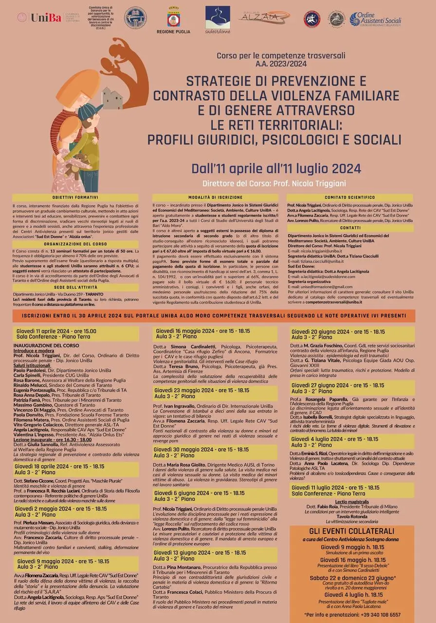 Il corso, realizzato in collaborazione con il CUG Uniba, è in fase di accreditamento presso l’Ordine degli Avvocati di Taranto, il CROAS Puglia e ha ottenuto il patrocinio della Fondazione Scuola Forense di Taranto.