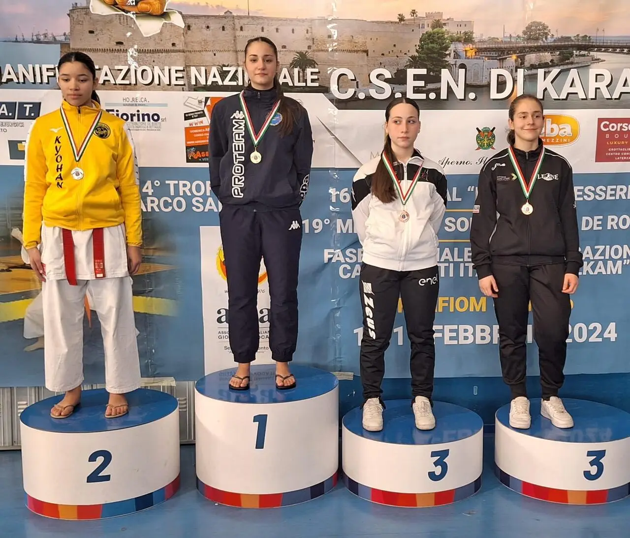Eccezionali risultati raggiunti dalla Pro Team nella fase regionale di karate della Federazione Fijlkam Puglia, un passo determinante per la qualificazione ai Campionati Italiani Cadetti. Spiccano le vittorie di Mirian Moccia (oro - Kumite 61 kg), Federico Cellamare (oro - Kumite 47 kg), Cosimo D’Andria (oro) e Cristian Villella (argento - Kumite 52 kg), e il bronzo di Luigi Peluso (Kumite 57 kg).