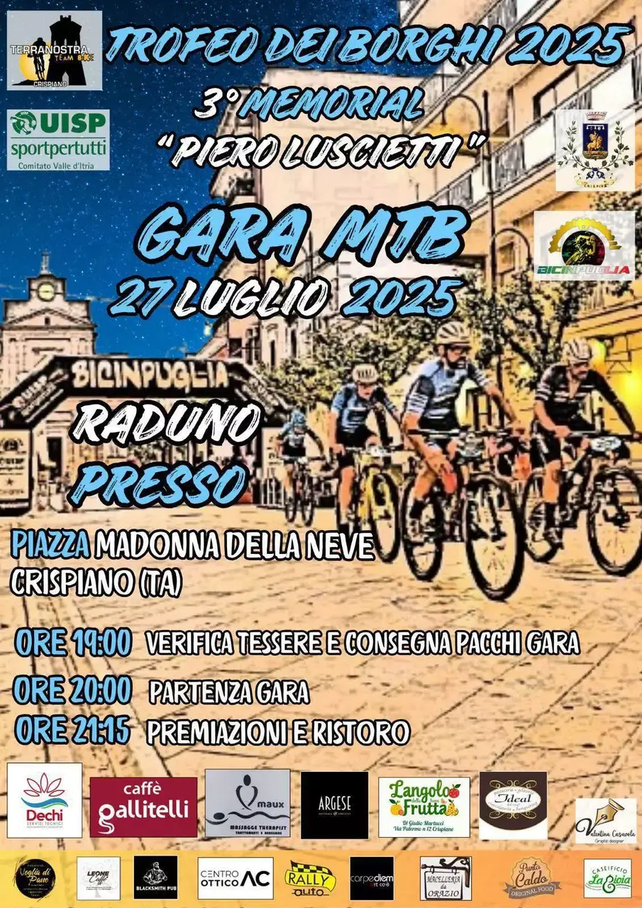 Il prossimo 27 luglio, il centro storico di Crispiano si trasformerà in un suggestivo circuito urbano per la terza edizione del “Trofeo dei Borghi – Memorial Piero Luscietti”, quarta tappa del campionato regionale promosso da Bicinpuglia e coordinato dall’ASD Terranostra Team Bike. La competizione, inserita nel calendario ufficiale UISP, proporrà un percorso tecnico di 2,6 chilometri da ripetere undici volte, con un dislivello che promette spettacolo e selezione.