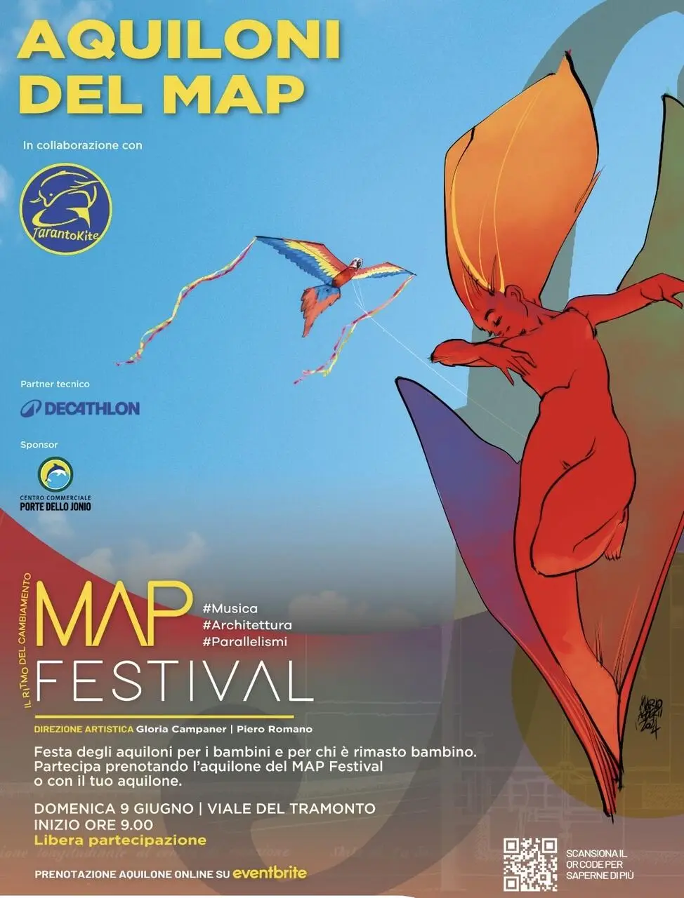 Dopo il concerto di Paolo Fresu e Omar Sosa a Villa Pantaleo e l’incontro con Alessandro Baricco nella Pineta Cimino, il MAP Festival prosegue con “Gli Aquiloni del MAP”, in programma domenica 9 giugno, dalle 9.00 alle 12.00 sulla spiaggia di Viale del Tramonto di San Vito a Taranto. La Festa degli aquiloni per i bambini, è un evento realizzato in collaborazione con l’Associazione TarantoKite. Libera partecipazione.