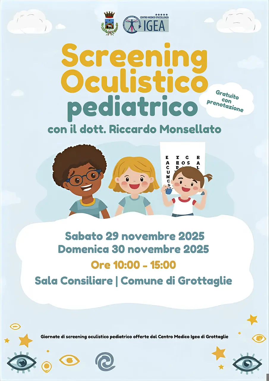 L’Assessorato alle Politiche Sociali del Comune di Grottaglie promuove, per i giorni 29 e 30 novembre 2025 dalle 10:00 alle 15:00 all'interno dell'aula consiliare del Comune di Grottaglie, una due giorni di screening oculistico pediatrico gratuito, resa possibile grazie alla disponibilità del Centro Medico IGEA di Grottaglie e alla professionalità del dott. Riccardo Monsellato, specialista in oftalmologia.