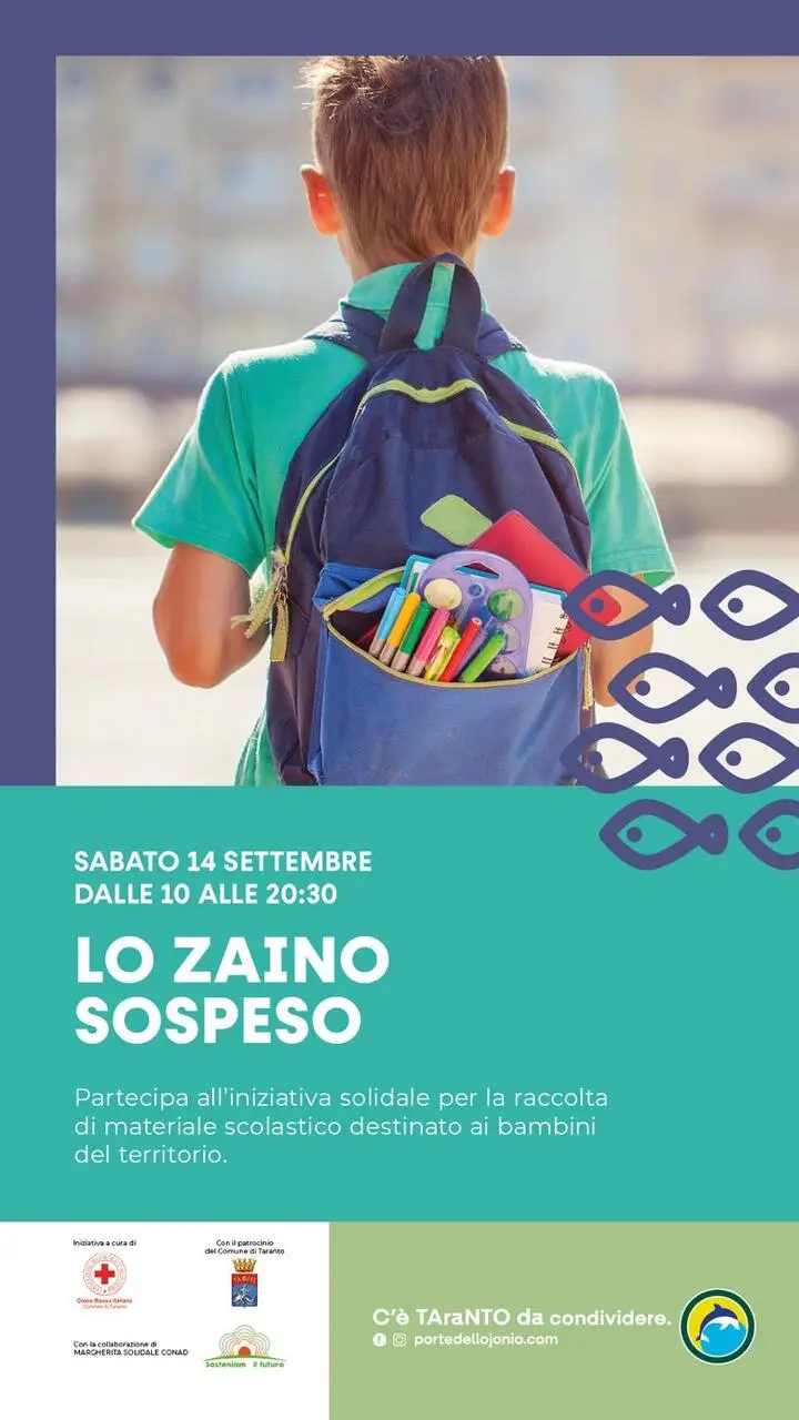 L'Amministrazione Melucci rilancia "Lo Zaino Sospeso", l'iniziativa solidale della Croce Rossa Italiana a cui il Comune di Taranto aderisce dal 2022. Il progetto, che si propone di sostenere le famiglie e i bambini in difficoltà economica, ha ottenuto un riscontro positivo negli ultimi anni.