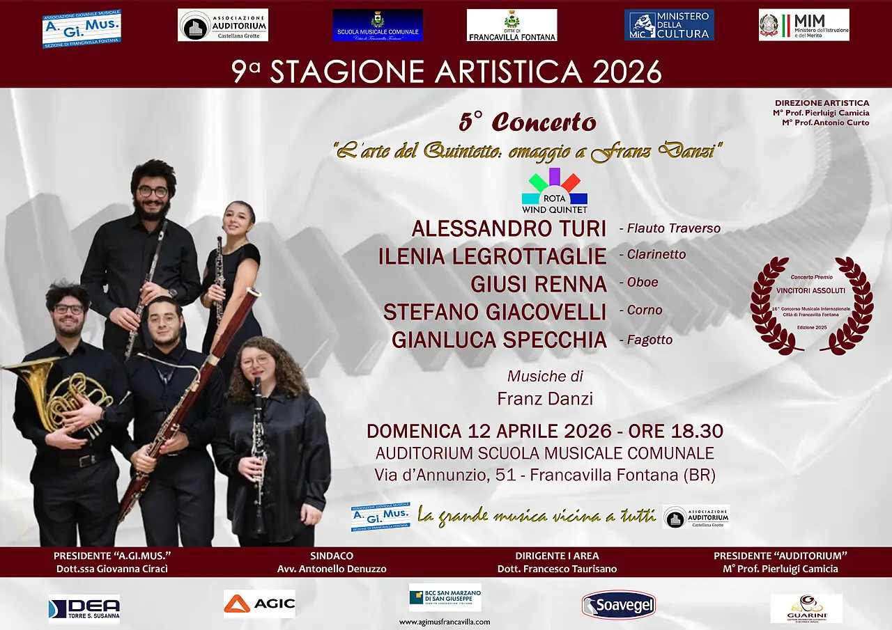 Il “Rota Wind Quintet”, composto dai talentuosissimi Alessandro TURI (Flauto Traverso), Giusi Renna (Oboe), Ilenia LEGROTTAGLIE (Clarinetto), Stefano GIACOVELLI (Corno) e Gianluca SPECCHIA (Fagotto), si esibirà in occasione del 5° appuntamento concertistico della nona Stagione Artistica 2026 organizzata dall’Associazione A.Gi.Mus. di Francavilla Fontana e dall’Associazione Auditorium di Castellana Grotte, sotto la direzione artistica dei maestri Pierluigi Camicia e Antonio Curto, e dal Comune di Francavilla Fontana, con il Patrocinio del MIC, del MIM e della Scuola Musicale Comunale “Città di Francavilla Fontana”.