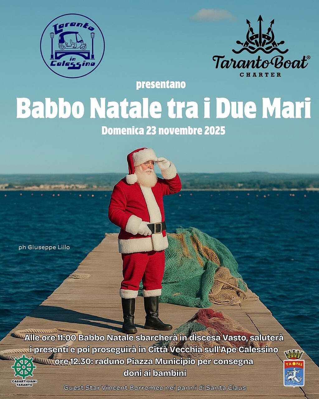 Direttamente dal Polo Nord, Babbo Natale approda nella Città dei due Mari… in barca! Domenica 23 novembre, dalle 11.00 alle 13.00, la Città Vecchia ospiterà l’evento “Babbo Natale tra i due Mari”, organizzato e autofinanziato da Casartigiani Taranto, Taranto Boat e Taranto in Calessino, all’interno del calendario comunale “Il Natale più lungo d’Italia”. A partire dalle ore 11.00, Babbo Natale solcherà il canale navigabile a bordo dell’imbarcazione di Taranto Boat, per poi approdare a Discesa Vasto, dove sarà accolto da cittadini, istituzioni e dai rappresentanti di Casartigiani Taranto. Successivamente, salirà sull’Ape Calessino per attraversare i vicoli della Città Vecchia e raggiungere Piazza Castello, dove saluterà i bambini e distribuirà piccoli doni simbolici (caramelle e una penna natalizia).