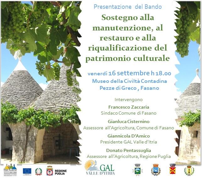 Si terrà il prossimo 16 settembre a Fasano presso il Museo della Civiltà Contadina di Pezze di Grecoil primo dei 4 incontri dedicati alla presentazione del bando pubblicato nei giorni scorsi dalla Regione Puglia e dedicato alla riqualificazione di trulli, lamie, casedde e pagliare ricadenti in zone agricole e realizzati entro la prima metà del secolo scorso.
