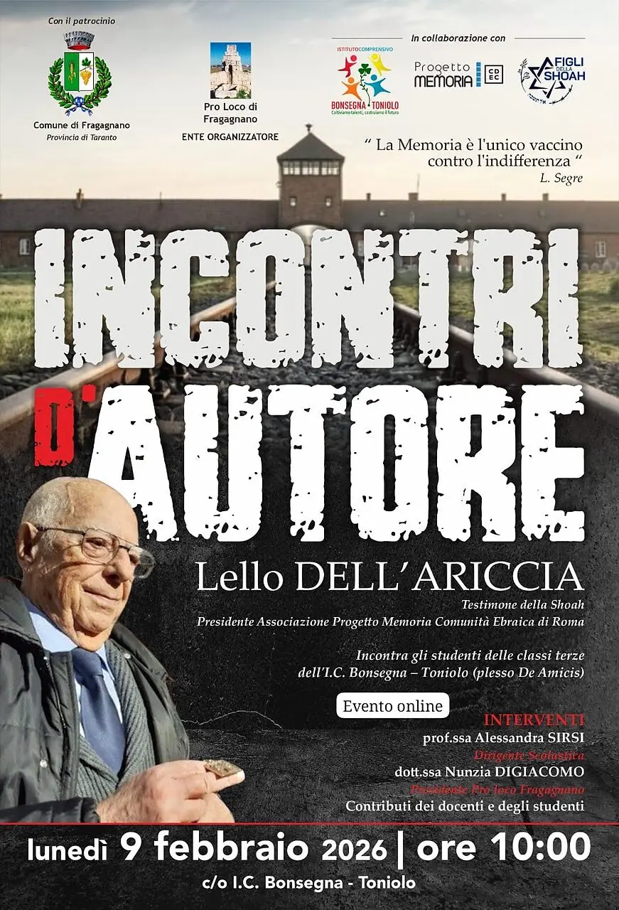 Lunedì 9 febbraio 2026, alle ore 10:00, presso l’Istituto Comprensivo Bonsegna-Toniolo, nel plesso De Amicis, si terrà un incontro in videoconferenza con Lello Dell’Ariccia, testimone diretto della Shoah e presidente dell’Associazione Progetto Memoria della Comunità Ebraica di Roma.