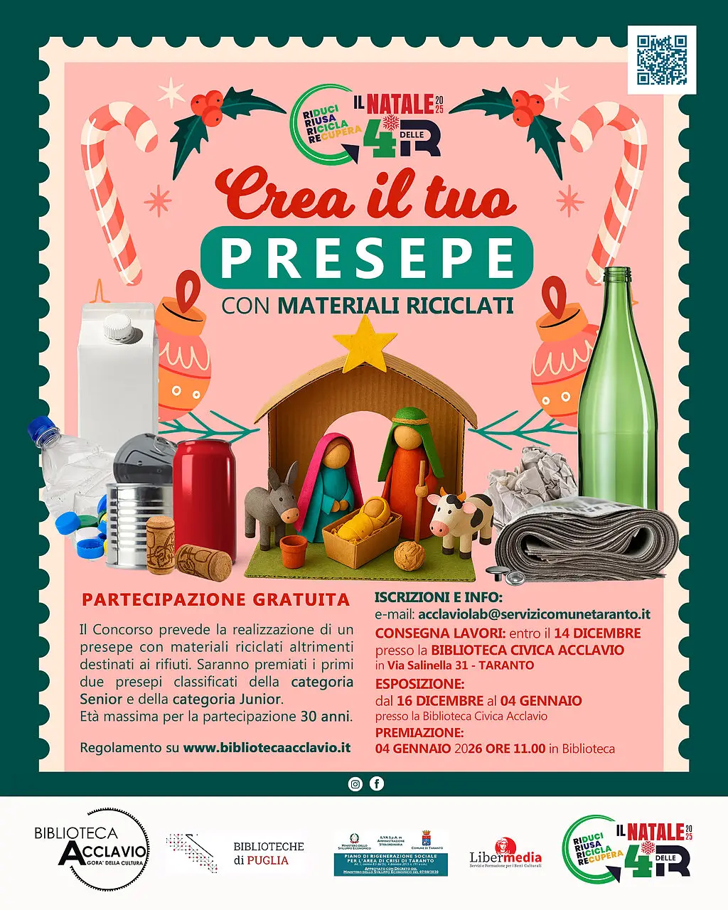 La Biblioteca Civica Pietro Acclavio rinnova anche per quest’anno l’appuntamento con il concorso “Il Presepe delle 4R”, un’iniziativa che unisce creatività e attenzione all’ambiente, invitando i più giovani a reinterpretare la tradizione natalizia attraverso il riciclo. Il contest è rivolto a tutti i partecipanti fino ai 30 anni e punta a trasformare materiali destinati allo scarto in opere originali e sostenibili.