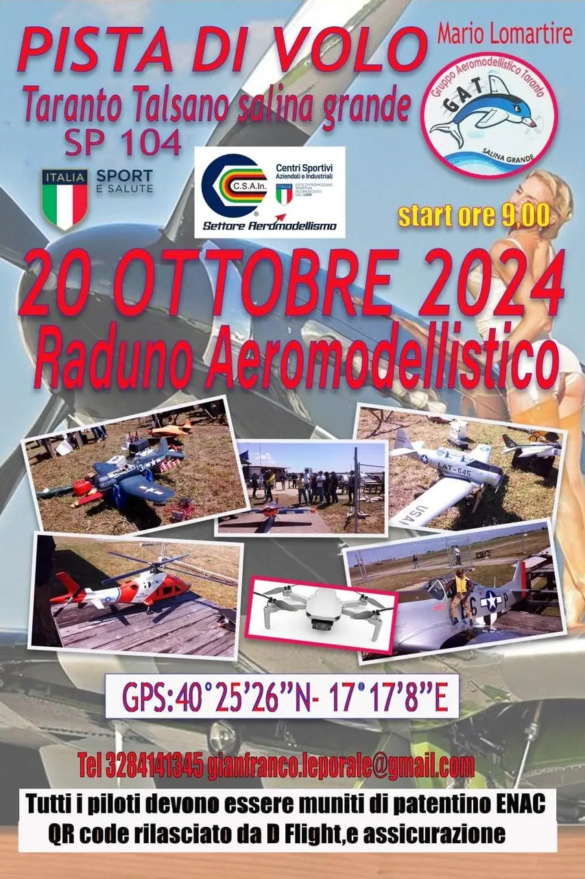 Domenica 20 ottobre 2024, nella pista del GAT di Talsano (Salina Grande), si terrà il consueto raduno annuale di aeromodellismo dinamico, organizzato dal Gruppo Aeromodellistico Tarantino.
