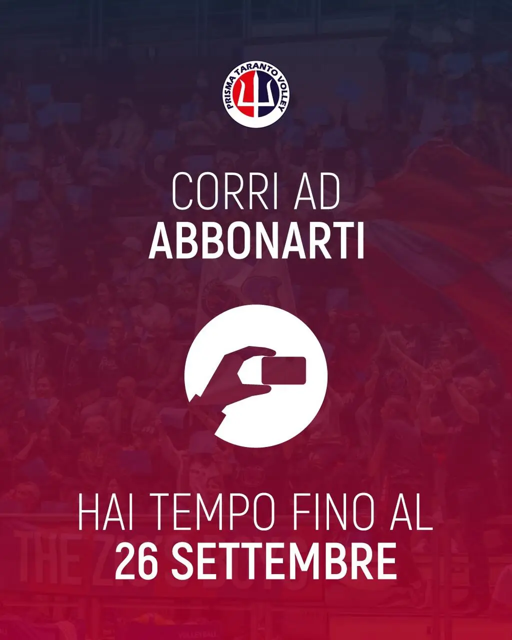 La Prisma Taranto Volley ricorda a tutti i tifosi rossoblù che la campagna abbonamenti “In Ogni Battito” resterà aperta fino a sabato 26 settembre 2025.