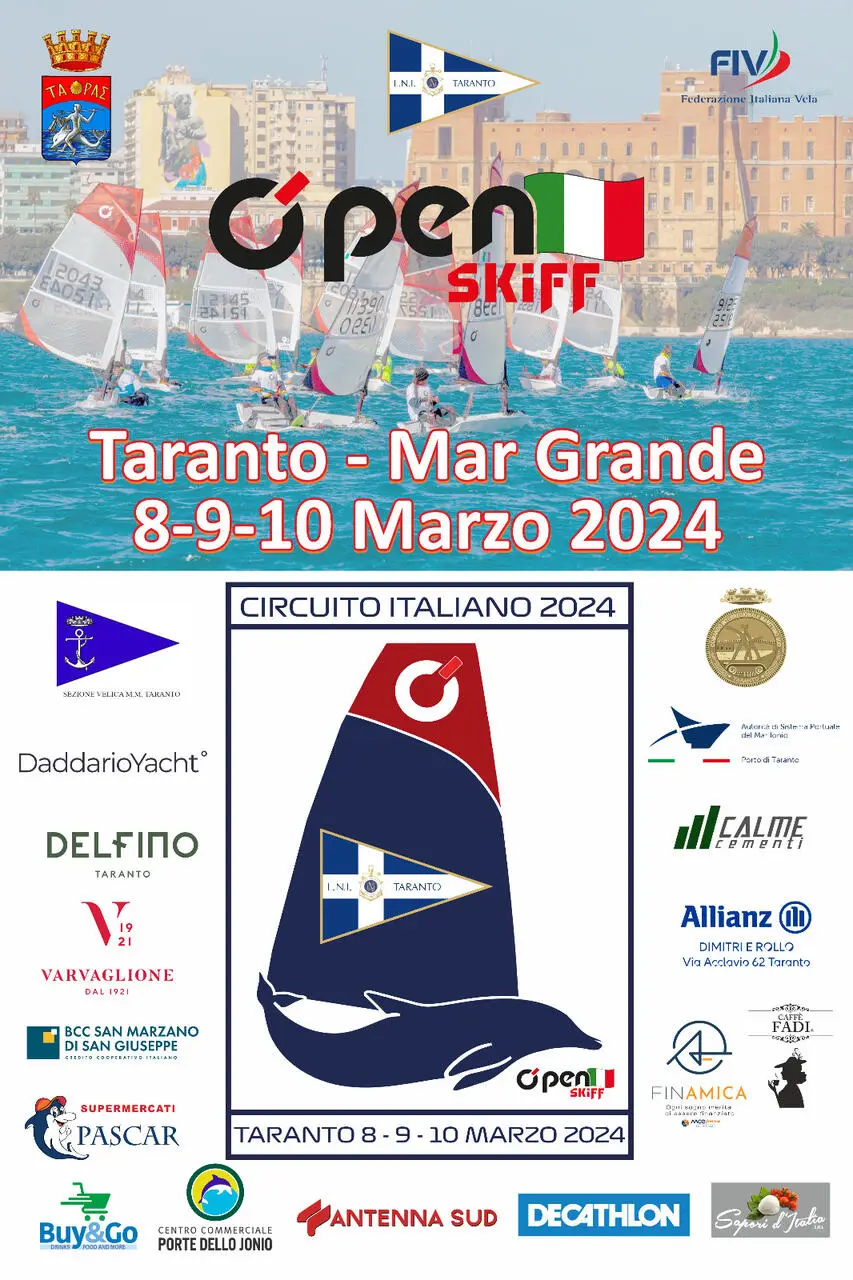 Si svolgerà mercoledì 6 marzo presso la Galleria del Centro Commerciale “Porte dello Jonio” a Tarato la conferenza stampa di presentazione della 1^ tappa del Campionato Italiano O’Pen Skiff che si svolgerà da venerdì 8 a domenica 10 marzo nelle acque del Mar Grande di Taranto antistanti il Lungomare Vittorio Emanuele III e vedrà la partecipazione di oltre 120 velisti provenienti da tutta Italia. La tappa è organizzata dalla Lega Navale Italiana sezione Taranto in collaborazione con la Sezione Velica della Marina Militare. Alla conferenza stampa di presentazione che sarà moderata dal giornalista Enrico Losito, interverranno: Gianni Azzaro , vice sindaco e assessore allo sviluppo economico, turismo e sport del Comune di Taranto; comandante Luigi Cau, presidente Sezione Velica Marina Militare di Taranto; Flavio Musolino, presidente della Lega Navale sez. di Taranto; Mauro Tatulli, shopping center manager Centro Commerciale Porte dello Jonio; Sergio Prete, presidente Autorità di sistema portuale di Taranto; Gianfranco Muolo, consigliere Nazionale della Classe O’pen Skiff Italia; Mario Cucciola, vice presidente comitato VIII zona - Puglia della FIV; Michelangelo Giusti, delegato provinciale CONI di Taranto e Giorgio Caramia, direttore Filiale Taranto 1 BCC San Marzano di San Giuseppe. Media partner dell’evento Antenna Sud.