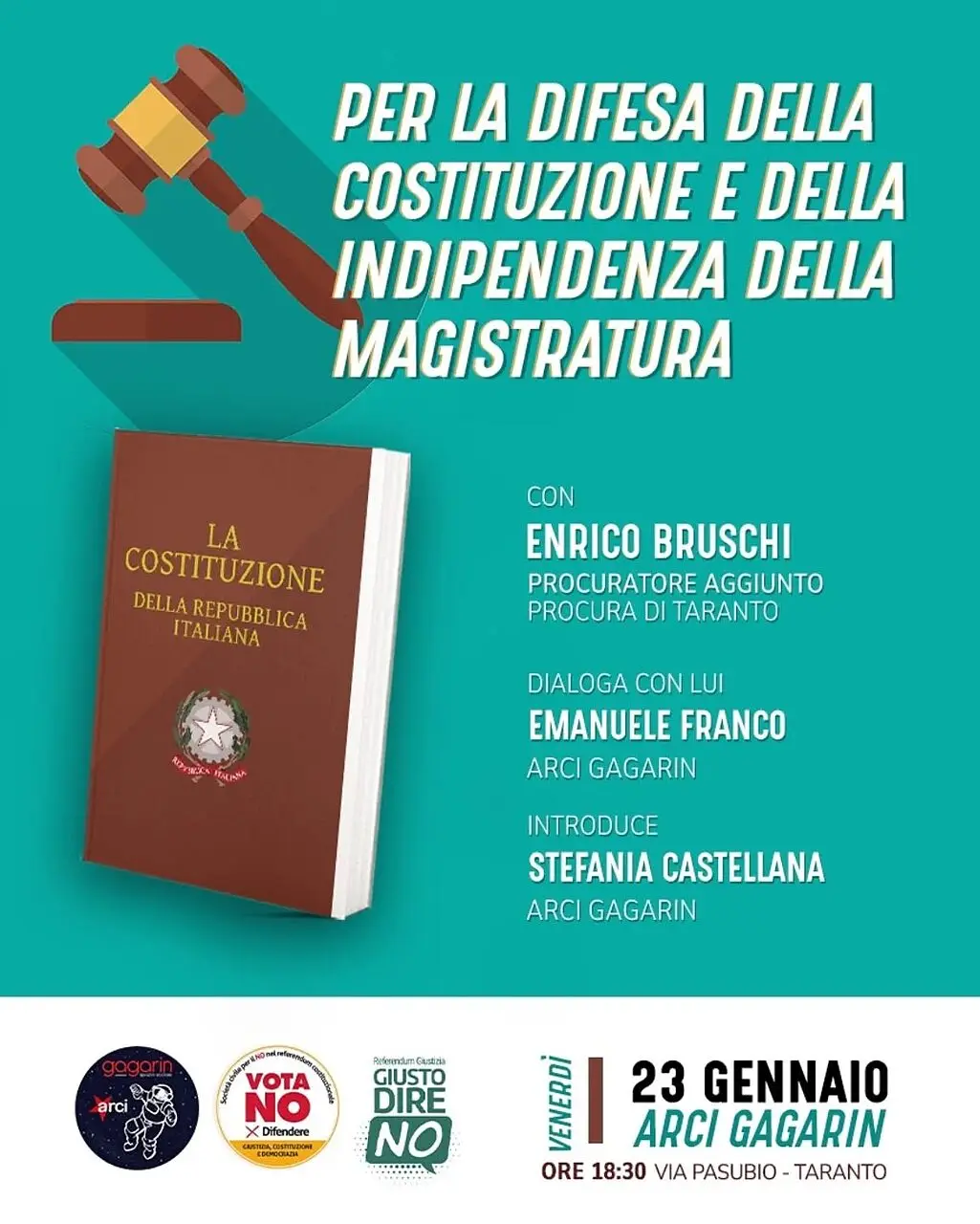 Venerdì 23 gennaio, alle 18.30, nella sede del Circolo Arci Gagarin di via Pasubio, a Taranto, è in programma l’incontro pubblico “Per la difesa della Costituzione e della indipendenza della magistratura”, promosso in vista dell’imminente referendum costituzionale sulla riforma della giustizia, nota come riforma Nordio.