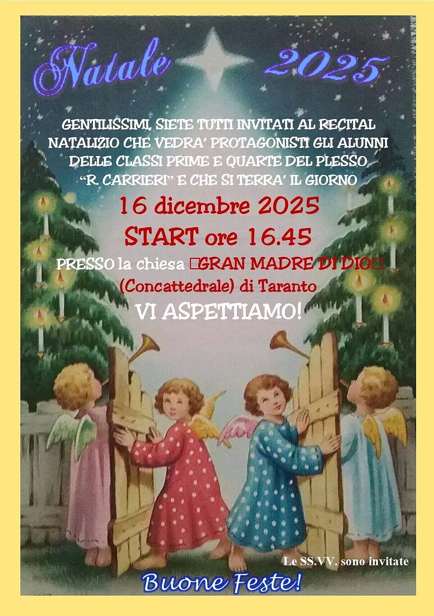 La magia del Natale incontra l'arte e l'educazione musicale: il prossimo 16 dicembre, a partire dalle ore 16:45, oltre 120 alunni delle classi prime e quarte della scuola primaria dell'Istituto Comprensivo Carrieri-Colombo saranno i protagonisti dello spettacolo natalizio "Tutti Insieme Appassionatamente...Cantiamo Il Natale!”