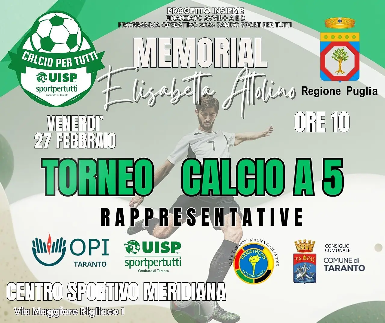 Sport, memoria e inclusione si incontrano nel primo Memorial “Elisabetta Attolino”, in programma venerdì 27 febbraio alle ore 10:00 presso il Centro Sportivo Meridiana di Taranto. L’iniziativa, promossa dalla UISP Taranto, trasforma il calcio a 5 in un momento di autentica condivisione dedicato a una figura storica del volontariato locale.
