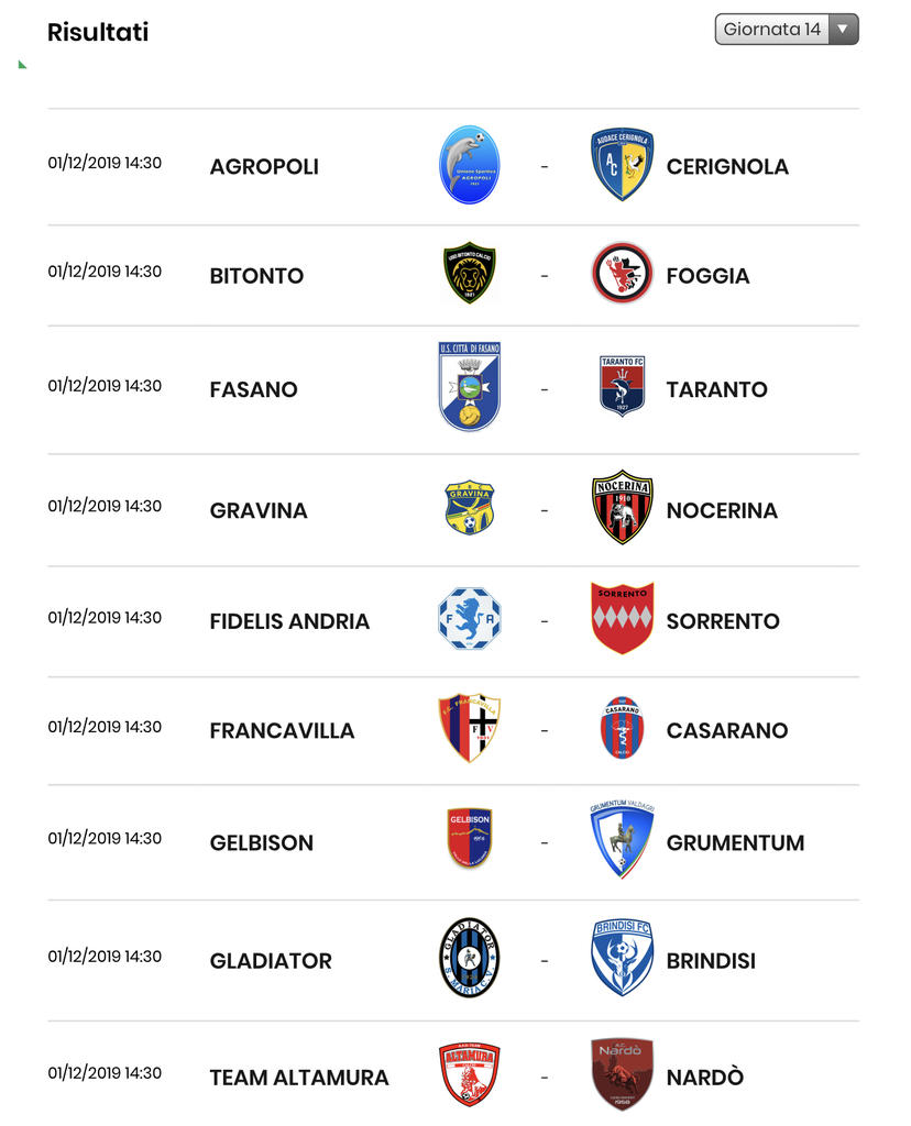 Battendo il Grumentum nella prosecuzione della gara valida per la 12a Giornata del Girone H della Serie D, sospesa per impraticabilità di campo il 17 novembre scorso, il Bitonto torna in vetta alla classifica con 29 punti superando il Foggia, ora a -2, e tenendo a debita distanza il Taranto, a -5. Domenica giornata da fuochi d'artificio, si scontrano le prime quattro della classifica: Bitonto-Foggia, Fasano-Taranto. Di seguito il quadro completo del 14° turno e la classifica aggiornata:
