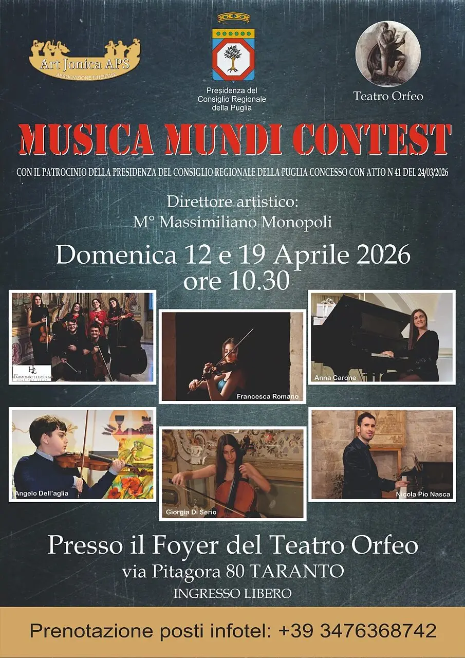 Taranto si prepara ad accogliere un nuovo appuntamento con la grande musica classica emergente. Domenica 12 aprile alle ore 10.30, presso il Foyer del Teatro Orfeo, si terrà il primo evento del Musica Mundi Contest, rassegna organizzata dall’Associazione Musicale Art Jonica APS con il patrocinio della Presidenza del Consiglio Regionale della Puglia.