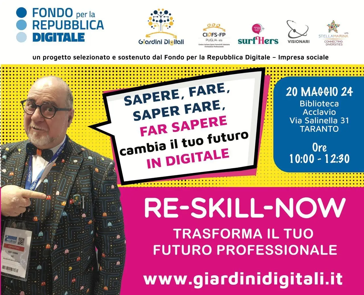Per partecipare a RE - Skill NOW e per maggiori informazioni, per non perdere l'opportunità di essere parte di questa rivoluzione professionale e digitale, info a: www.giardinidigitali.it, o al numero 351 6557817.