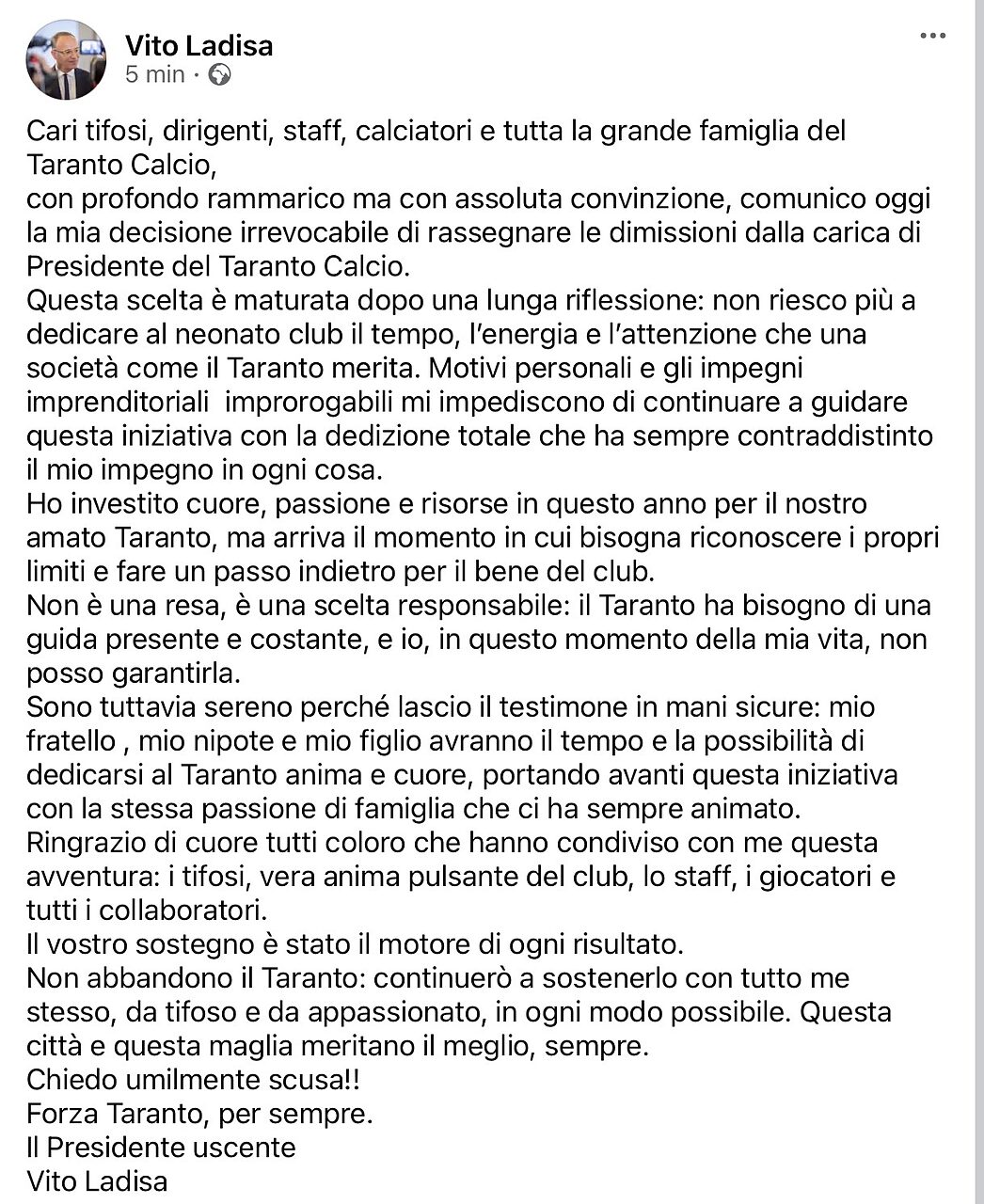 Home / TARANTO CALCIO Taranto, Vito Ladisa si è dimesso: la lettera del presidente 04 January 2026, 22:59 Twitter Facebook Whatsapp Telegram Email Vito Ladisa Taranto, Vito Ladisa si è dimesso: la sua lettera.