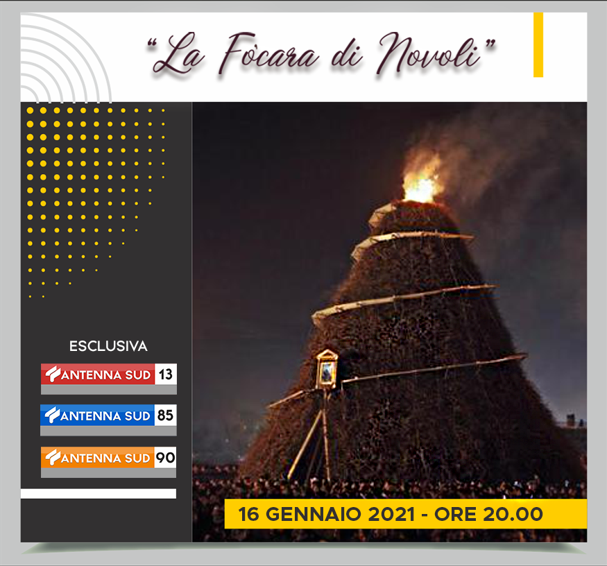 La “Fòcara” di Novoli in esclusiva sui canali tv di Antenna Sud, si tratta di uno degli eventi pugliesi più attesi, in grado di fondere religione, cultura, tradizione e spettacolo, sabato 16 gennaio alle 20:00 la diretta TV consentirà di poter assistere a questo appuntamento unico nel suo genere. Un ulteriore contributo da parte del Gruppo Editoriale Distante che, in collaborazione con l’Amministrazione Comunale di Novoli, offrirà ai telespettatori immagini suggestive da vivere insieme sulle proprie reti, partecipando da casa ad una serata importante per tutta la Puglia. La suggestiva accensione della Fòcara 2021, quest’anno non avrà spettatori dal vivo, a causa delle restrizioni dovute al Covid-19, pertanto l’evento è stato pensato esclusivamente per la televisione. Antenna Sud trasmetterà a reti unificate sui canali 13, 85 e 90 l’intero programma del tradizionale avvenimento, in diretta dal piazzale antistante il santuario di Sant’Antonio Abate, patrono di Novoli, circa novanta minuti di emozioni, musica sacra ed un corteo di musicisti e trampolieri, un canto dedicato al Santo. Sulla facciata della Chiesa, un video mapping celebrerà la nascita del rito della Fòcara con le testimonianze storiche. Tutto da seguire in diretta TV, in streaming su www.antennasud.com ed in diretta FB sulle pagine ufficiali delle emittenti. (Comunicato stampa)