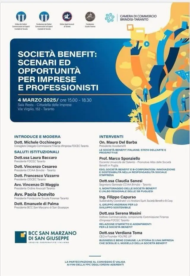 Le società benefit rappresentano un nuovo modello di impresa capace di coniugare profitto e impatto positivo sulla società e sull’ambiente. Questo innovativo paradigma economico sarà al centro del convegno “Società Benefit: opportunità per imprese e professionisti”, organizzato dalla Fondazione dei Dottori Commercialisti ed Esperti Contabili di Taranto, dall’Ordine dei Dottori Commercialisti ed Esperti Contabili di Taranto e dalla Camera di Commercio di Brindisi-Taranto, con il patrocinio dell’Ordine degli Avvocati di Taranto e della Fondazione Scuola Forense di Taranto, e con il sostegno della BCC San Marzano di San Giuseppe.